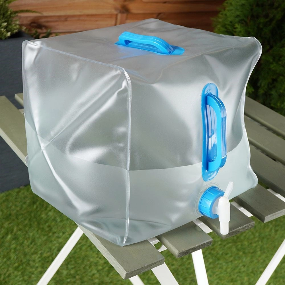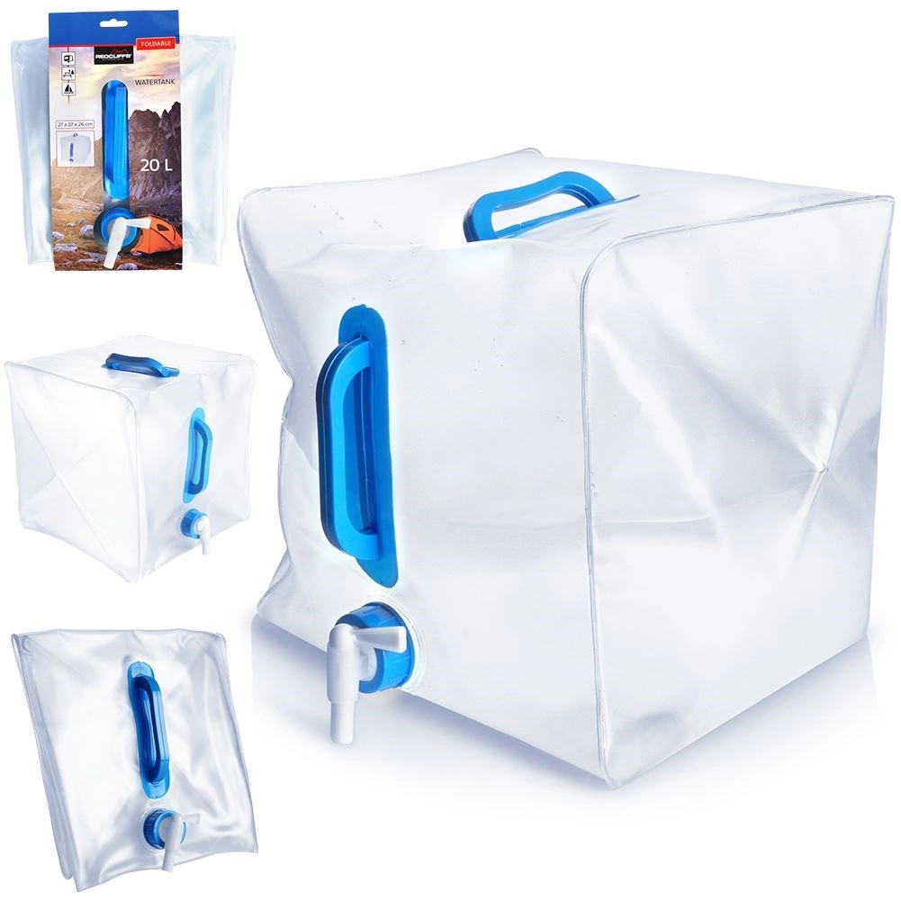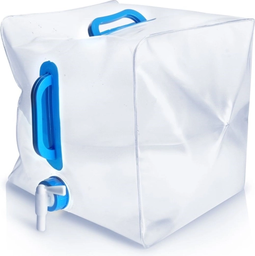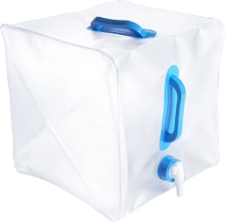 Sulankstomas 20 litrų geriamojo vandens kanistras pagamintas iš kokybiško permatomo plastiko, kuris yra patvarus ir kartu lengvas. Įmontuotas čiaupas užtikrina valdomą pylimą be išsiliejimo, o ergonomiškos rankenos palengvina nešiojimą net ir pilno bakelio.