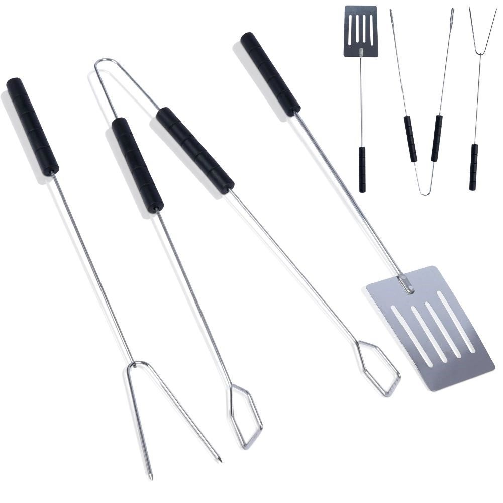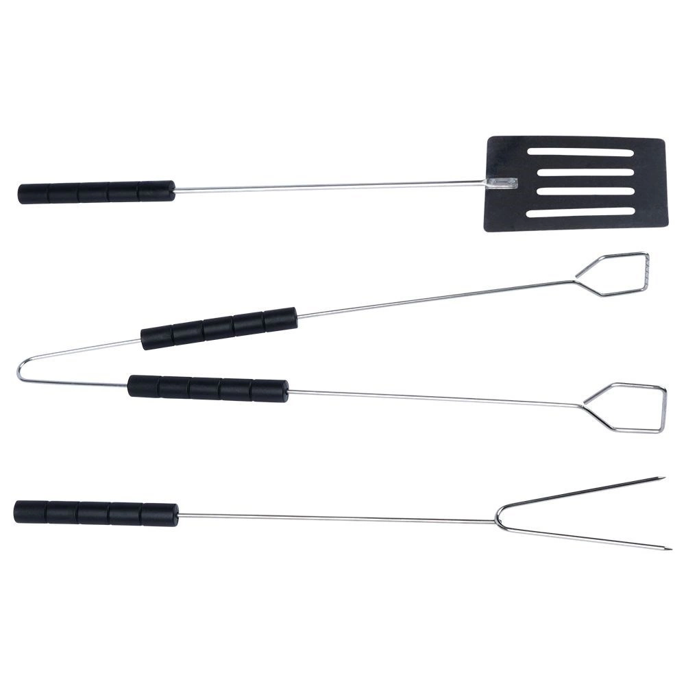 Praktiškas tvirto plieno grilinimo įrankių rinkinys apima mentelę, žnyples ir šakę, kurių ilgis 38 cm. Dėl ilgų rankenų prie grilio būsite saugiu atstumu, patvarios medžiagos užtikrina ilgaamžiškumą, o patogūs neslystantys laikikliai palengvina maisto valdymą namuose ir sode.