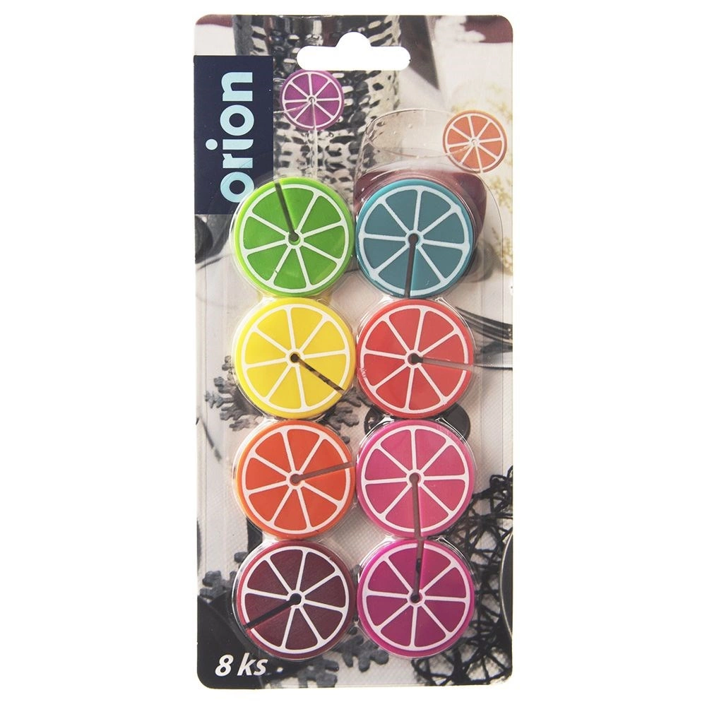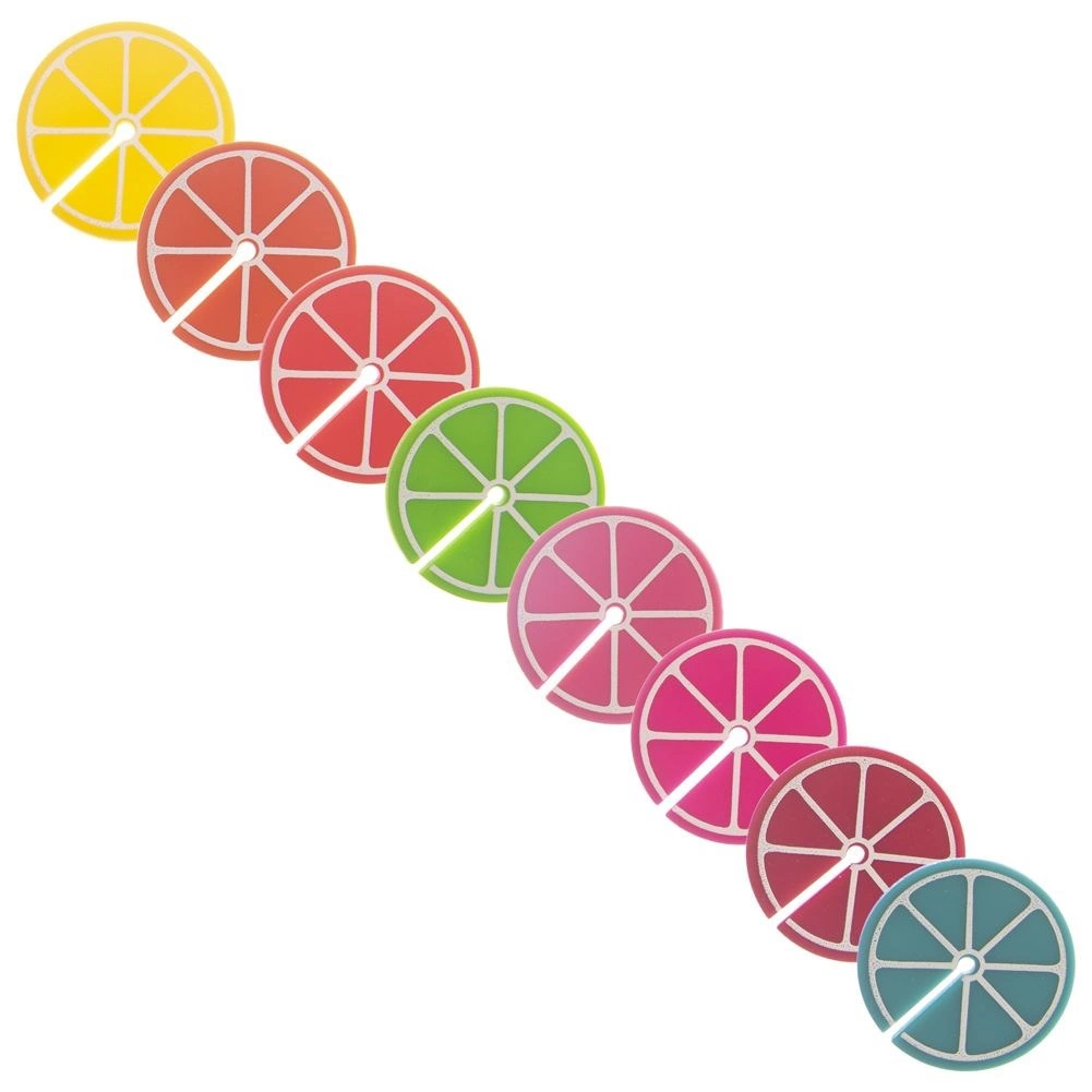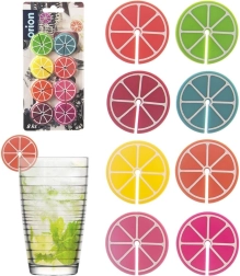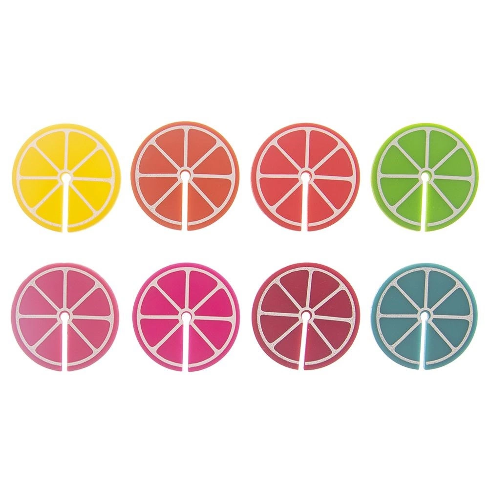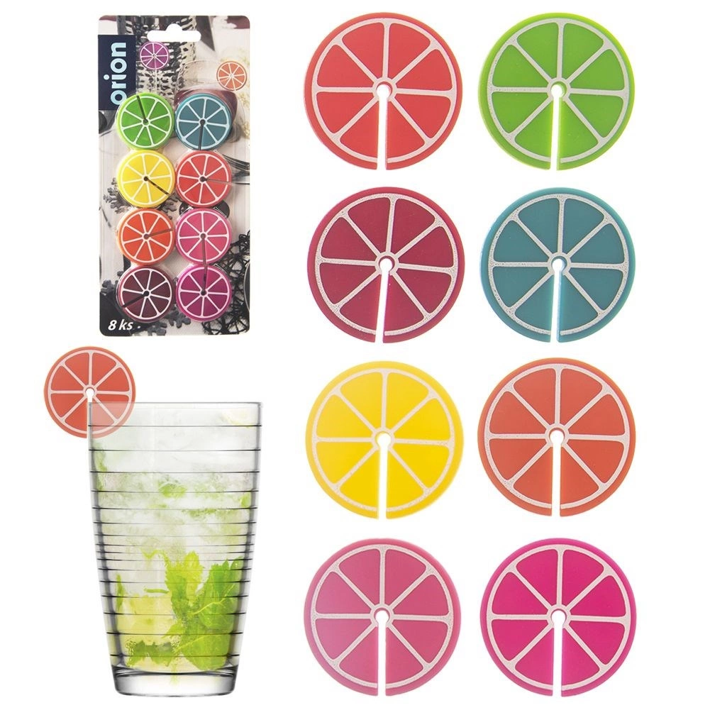 Praktiškas 8 spalvingų žymeklių rinkinys taurėms ir stiklinėms, citrusinių skiltelių formos, 3,7 cm skersmens. Dėl skirtingų spalvų kiekvienas svečias lengvai atpažins savo gėrimą. Pagaminti iš silikono, tinkami pakartotiniam naudojimui, idealiai tinka vakarėliams ir šeimos susibūrimams.