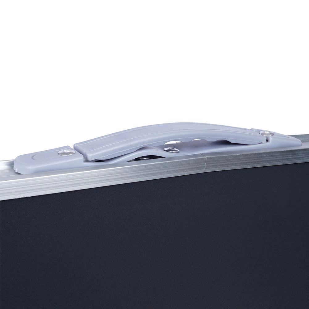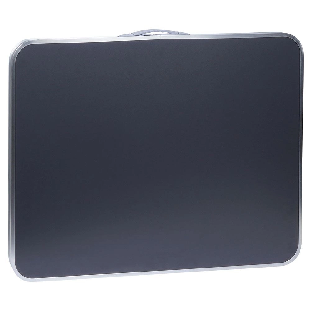MDF stalviršis apsaugotas patvaria paviršiaus danga, kuri geriau atspari drėgmei ir kasdieniam nusidėvėjimui. Stabili metalinė konstrukcija su aliuminio apvadu išlaiko formą ir suteikia stalui tvirtumo. Sulanksčius matmenys 80 × 61,5 × 6 cm, po stalviršiu yra vieta kojoms sudėti, o dėl integruotos rankenos stalą lengva pernešti.
