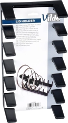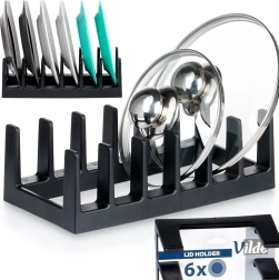 Praktiškas dangčių ir lėkščių stovas, matmenys 28 × 15 × 9 cm, talpina iki 6 vienetų. Dėl atsparaus plastiko juodos spalvos yra lengvas, lengvai valomas ir ilgaamžis. Į jį sudėsite dangčius, plokščias ir kai kurias gilesnes lėkštes arba pjaustymo lenteles, taip palaikysite tvarką virtuvės spintelėje ar stalčiuje.