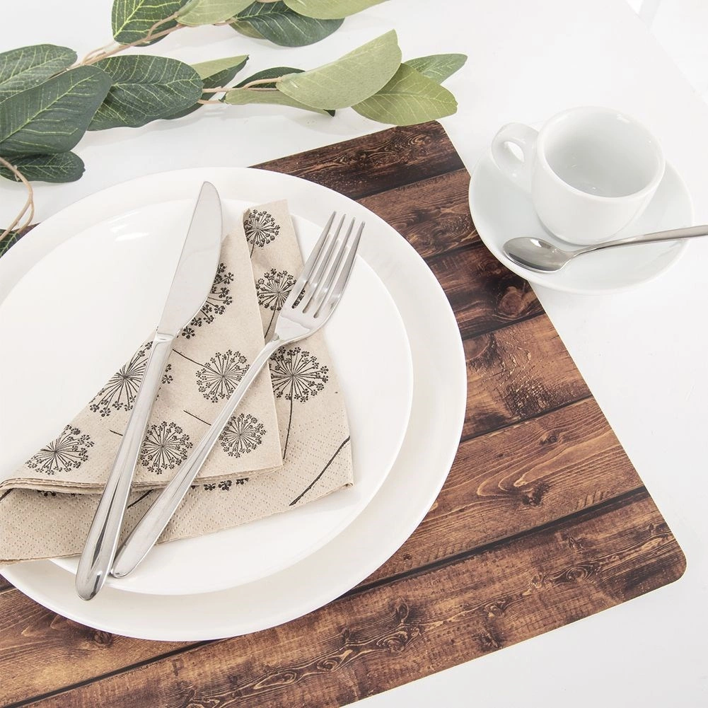 Stalo padėkliukas su realistišku medžio dekoru yra praktiškas ir dekoratyvus virtuvės ar valgomojo akcentas. Dėl 43 × 30 cm dydžio puikiai tinka po lėkšte, saugo stalo paviršių nuo dėmių ir įbrėžimų, o kartu pabrėžia jūsų stalo indų komplektą.