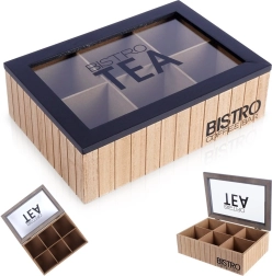 Sutvarkykite savo arbatos kolekciją elegantiška dėžute, kuri derina praktišką išdėstymą ir patrauklų dizainą. Šeši atskirti skyreliai leidžia rūšiuoti skirtingas arbatos rūšis ir skonius, o stiklinis dangtis su juodu rėmeliu suteikia greitą turinio apžvalgą. Idealu namams, kavinėms, bistro ar biurui.