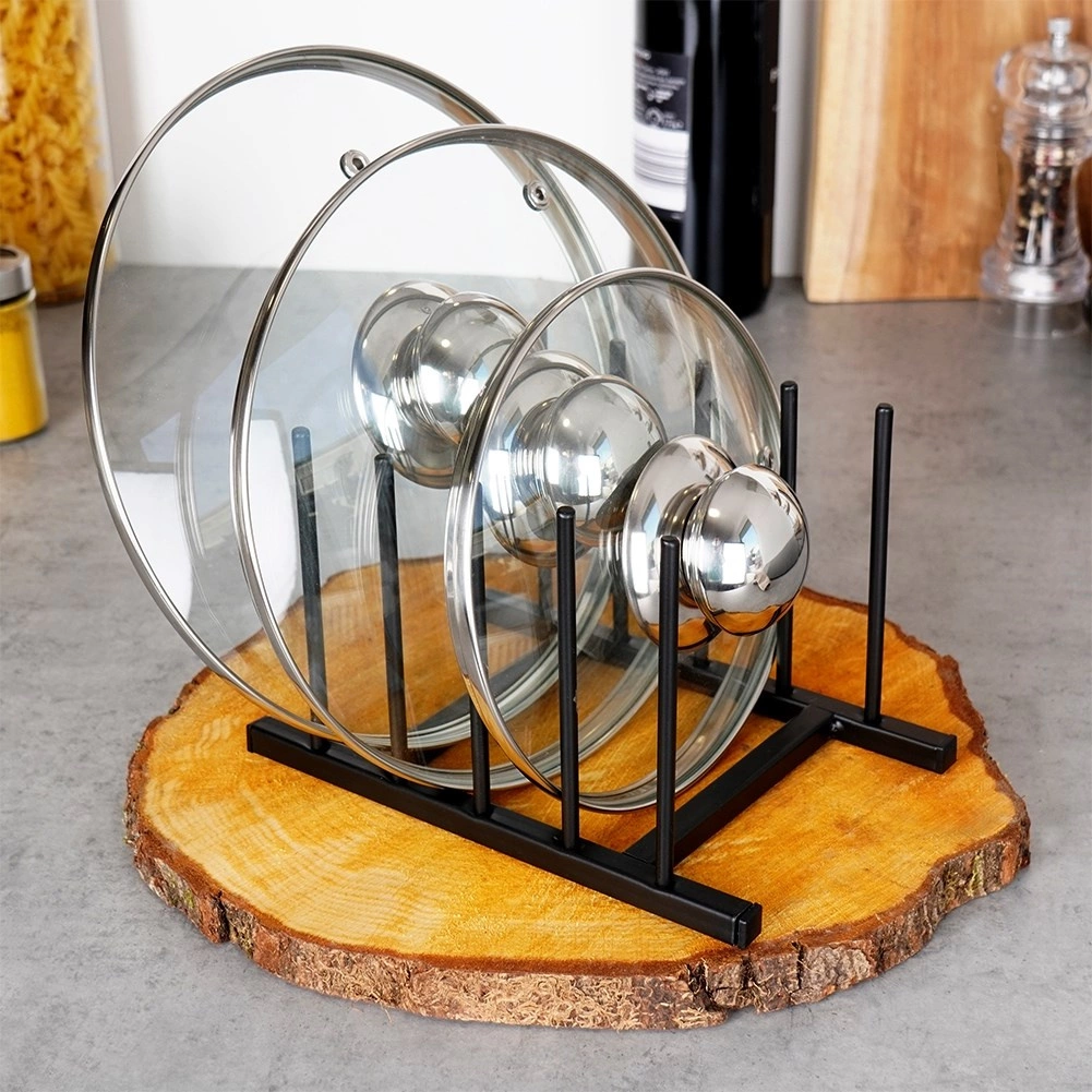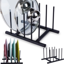 Sutvarkykite virtuvę ir turėkite dangčius bei lėkštes visada po ranka. Metalinis stovas su tvirtu stačiakampiu pagrindu laiko indus vertikalioje padėtyje, taupo vietą ir užtikrina gerą oro cirkuliaciją lengvam džiovinimui. Minimalistinis juodas dizainas tinka tiek moderniems, tiek klasikiniams interjerams.