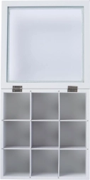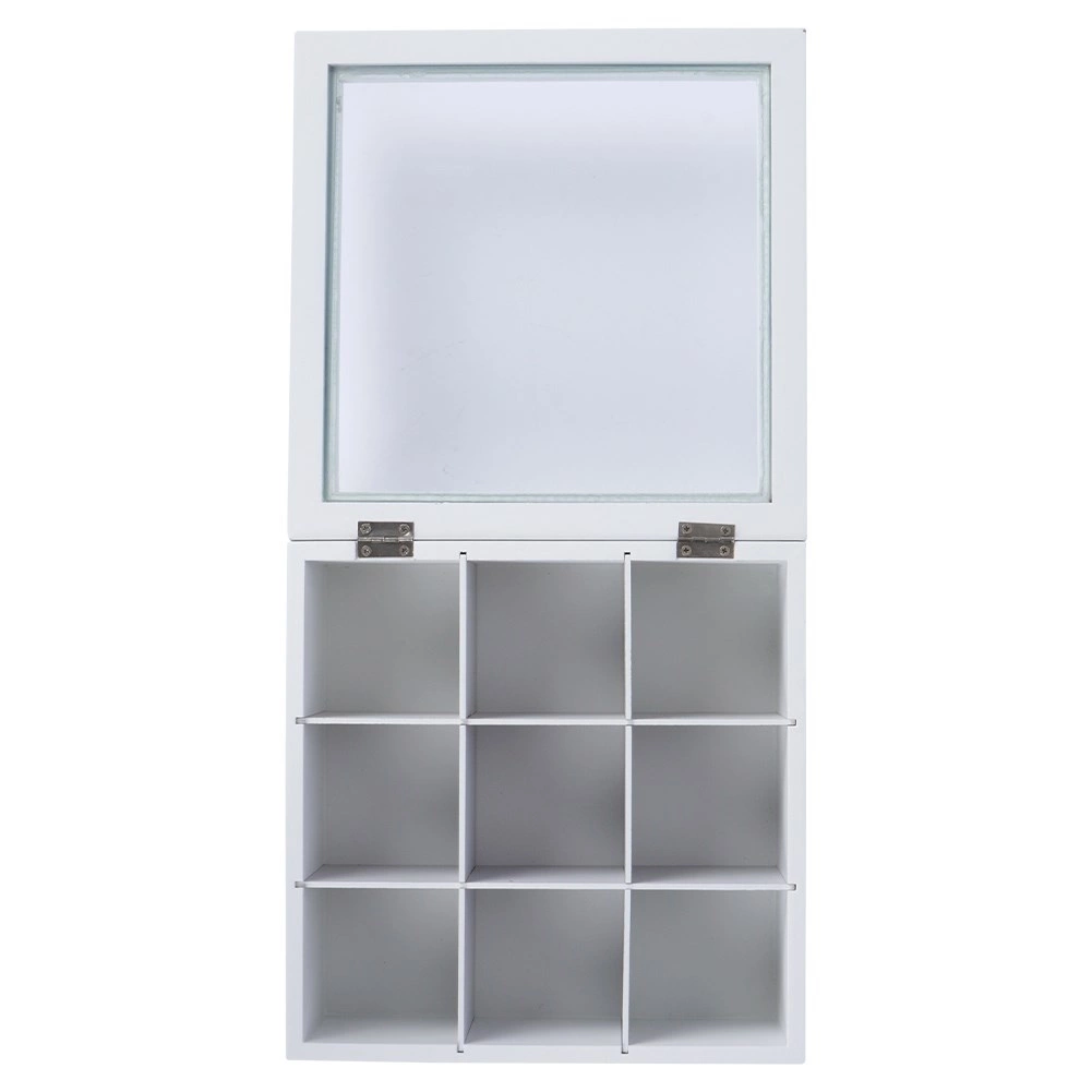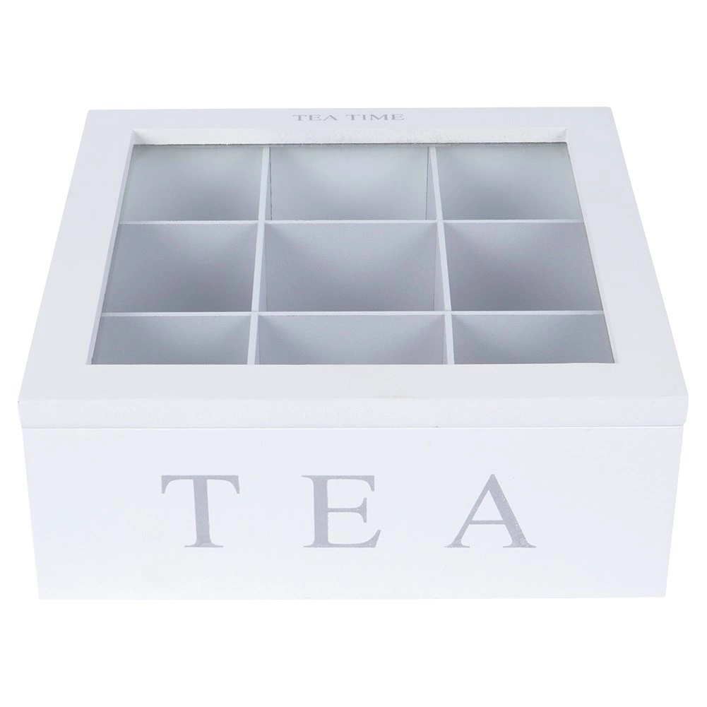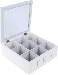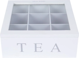 Elegantiška balta arbatos dėžutė su permatomu dangteliu ir 9 skyriais padės tvarkingai ir šviežiai laikyti mėgstamas arbatas. Patvari MDF konstrukcija, užrašai „TEA“ ir „TEA TIME“ bei vyriukais tvirtinamas uždarymas užtikrina stilių ir praktiškumą kiekvienoje virtuvėje.