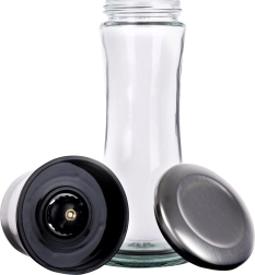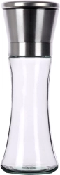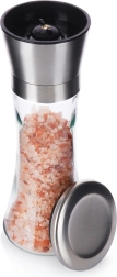 Elegantiškas rankinis druskos, pipirų ir kitų prieskonių malūnėlis, 19 cm aukščio, derina skaidrų stiklą ir nerūdijantį plieną. Dėl keraminio malimo mechanizmo patikimai mala net kietus grūdus, o sklandi rupumo reguliacija leidžia nustatyti tiksliai tokią tekstūrą, kokios reikia. Praktiškas apsauginis dangtelis neleidžia byrėti likučiams ir palaiko virtuvę švarią.