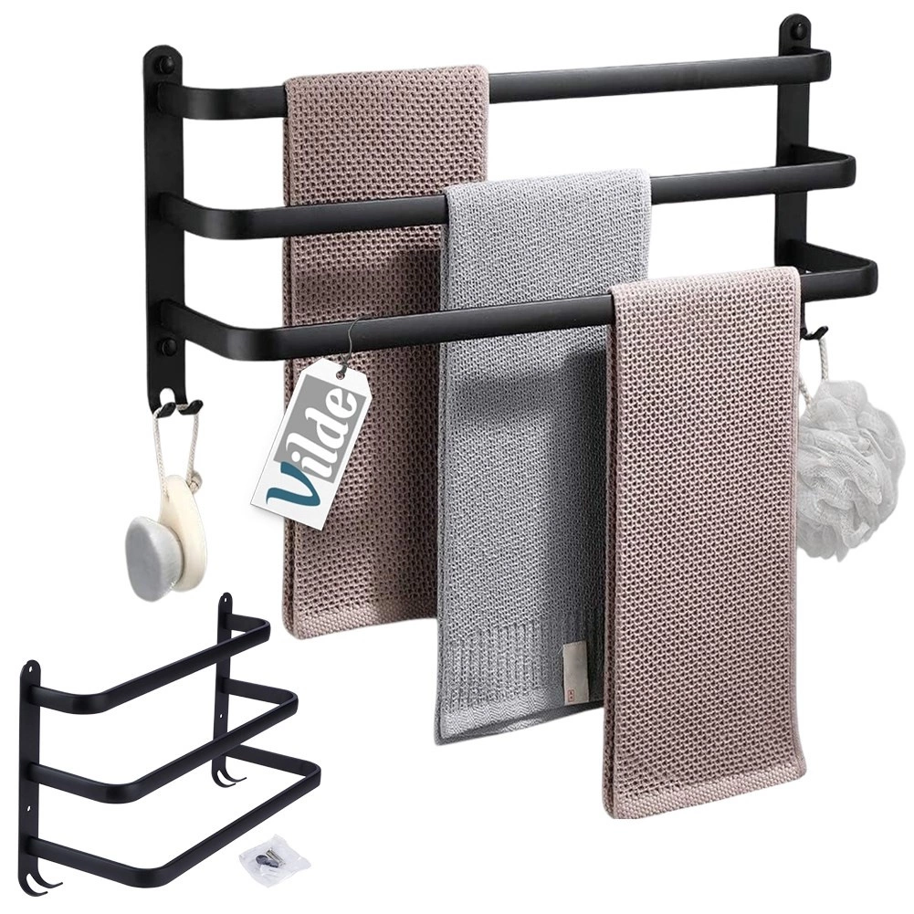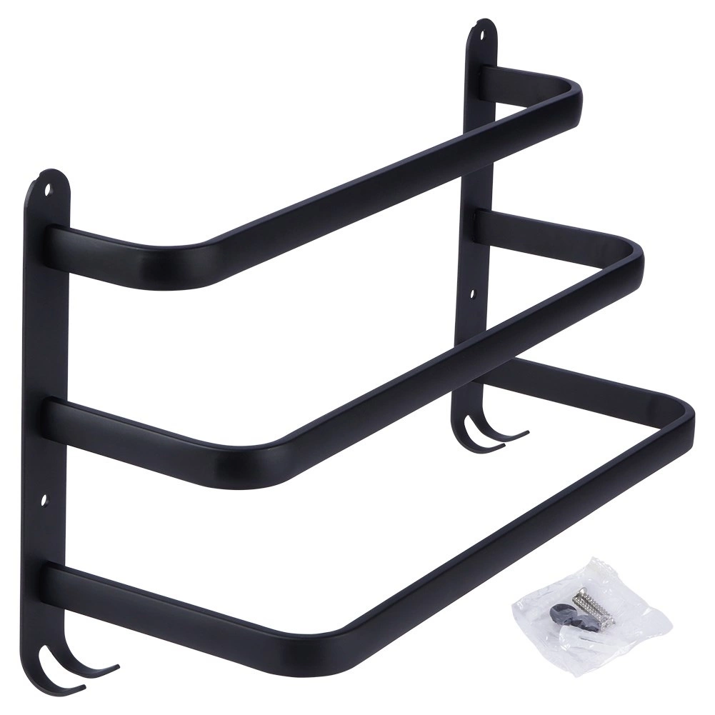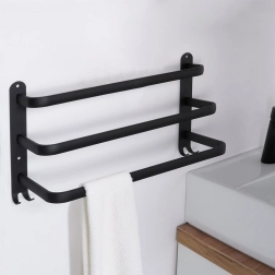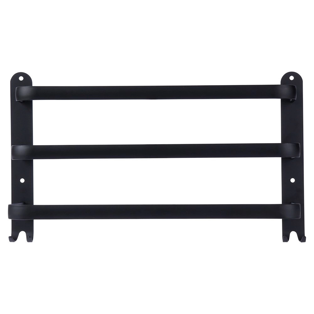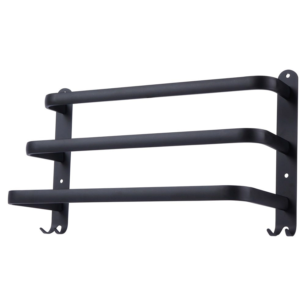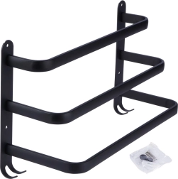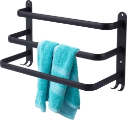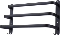 Stilingas ir patvarus rankšluosčių laikiklis tvarkingai jūsų vonios kambario organizacijai. Trys horizontalios juostos užtikrina efektyvų rankšluosčių džiovinimą ir vėdinimą, o keturi kabliukai apačioje suteiks vietos plaušinėms ar aksesuarams. Minimalistinis matinės juodos spalvos dizainas puikiai dera skandinaviško, modernaus ir loftinio stiliaus interjeruose.