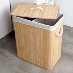 Tekstilinė įmautė yra padalinta į dvi kameras, todėl skalbinius lengvai išrūšiuosite dar dedant juos į krepšį. Be to, įmautę galima išimti ir išskalbti, kas palengvina priežiūrą. Dėl šoninių virvinių laikiklių krepšį patogiai nunešite ten, kur jo reikia.