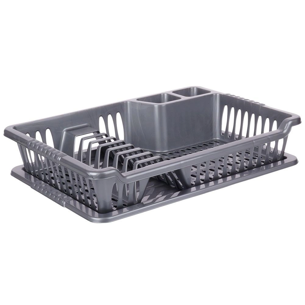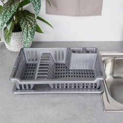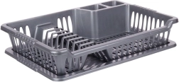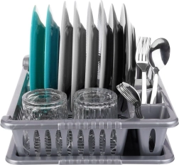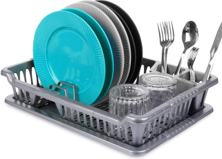 Praktiška pilka indų džiovyklė, 40 × 29 × 8,5 cm, palaiko virtuvės stalviršį sausą ir indus tvarkingai sutvarkytus. Turi išimamą lašėjimo padėklą, vietas lėkštėms, puodeliams ir įrankiams, pagaminta iš kokybiško plastiko be BPA. Ideali kasdieniam naudojimui, lengvai valoma ir tinka tiek modernioms, tiek klasikinėms virtuvėms. Be BPA, nuimamas padėklas, vieta 8 lėkštėms, patogūs skyreliai įrankiams.