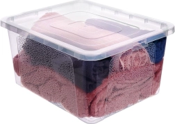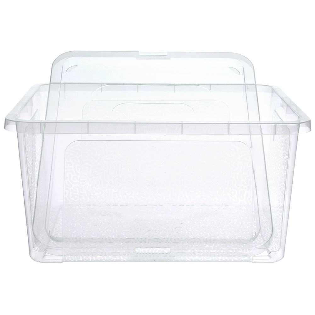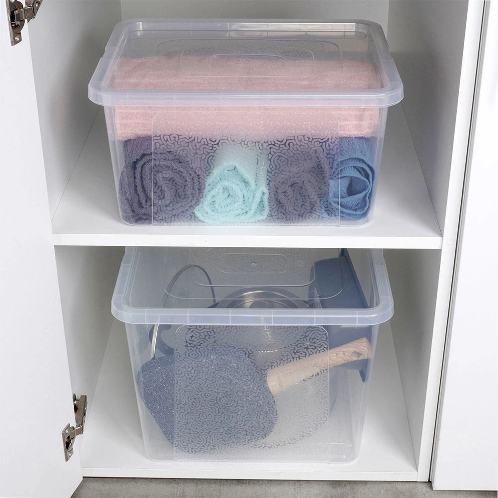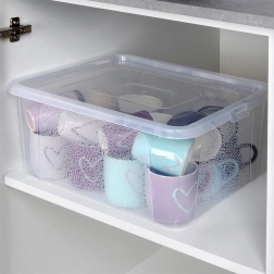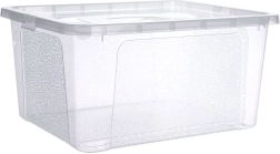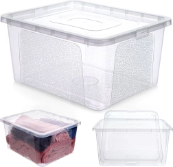 Universalus laikymo dėžė su dangčiu padės tvarkingai susidėti tekstilę, žaislus, knygas, įrankius ir sezoninę įrangą. Skaidrus korpusas leidžia greitai patikrinti turinį neatidarant, o lengvu „spragt“ užsidarantis dangtis patikimai užveria ir apsaugo viską viduje. Suapvalinti kampai didina saugumą naudojant, o kraštai, pritaikyti dėžėms stertyti, taupo vietą lentynose ir drabužių spintose.
