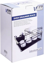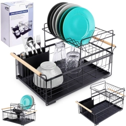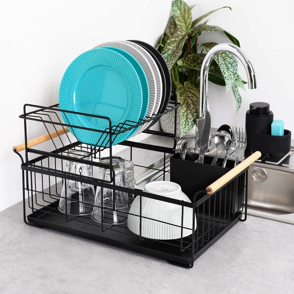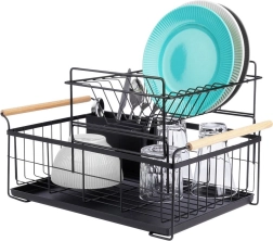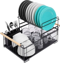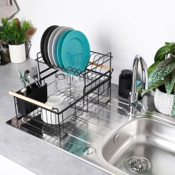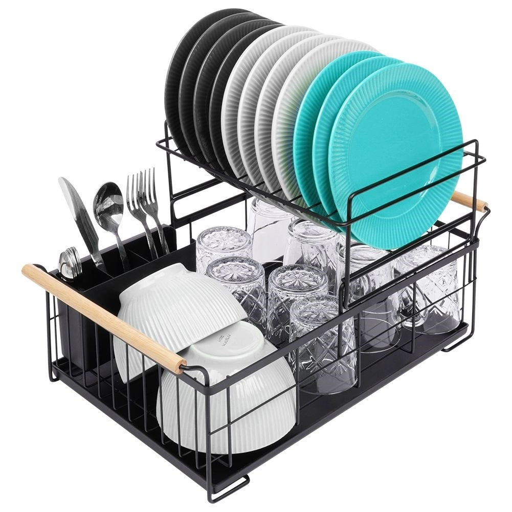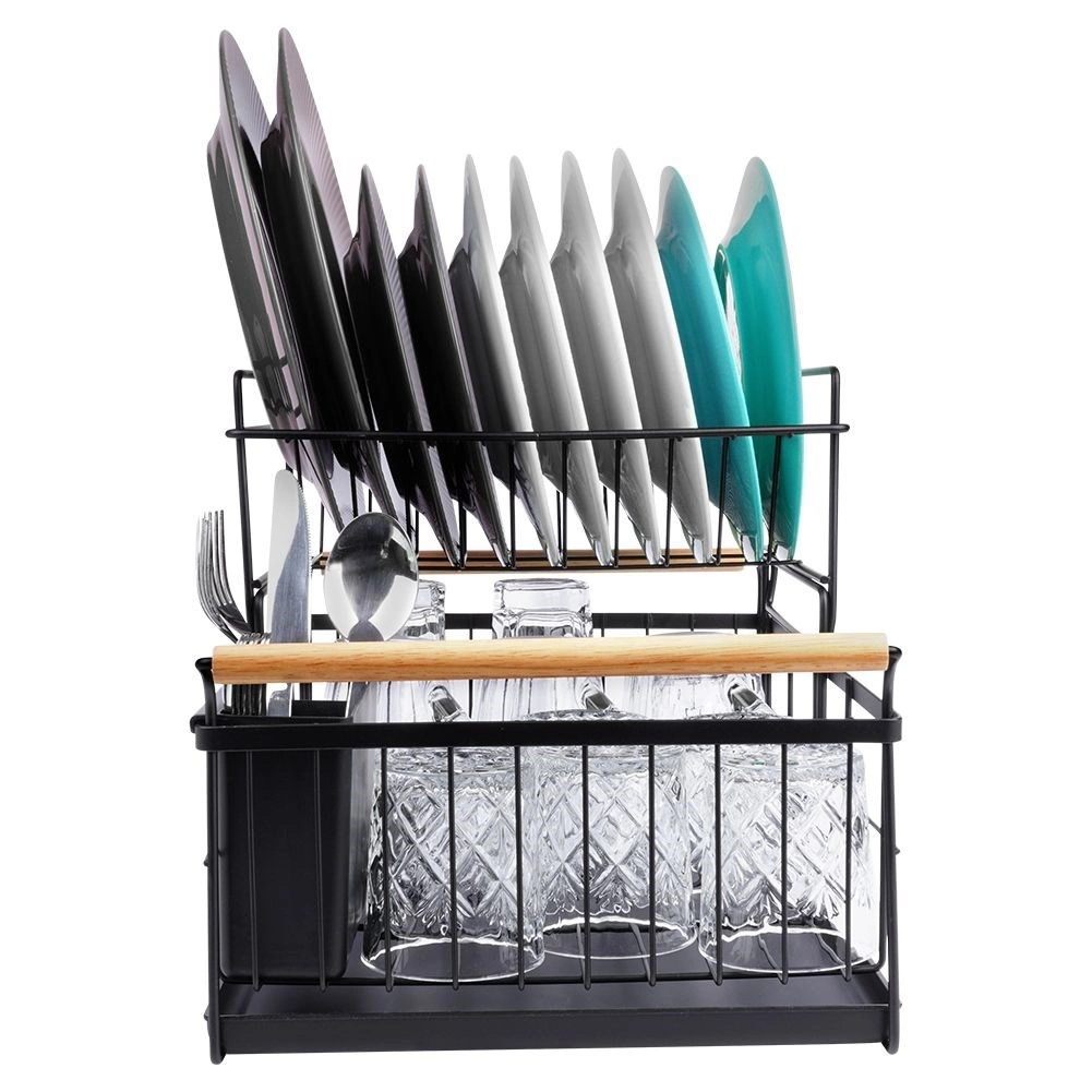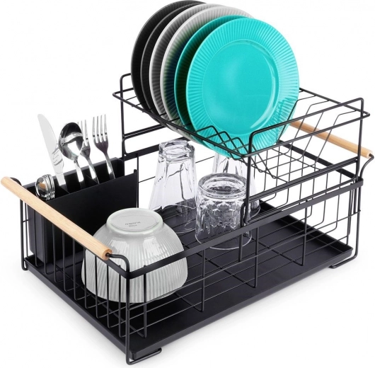 Elegantus dviejų aukštų indų džiovintuvas juodos spalvos taupo vietą ir palaiko virtuvinį paviršių sausą bei tvarkingą. Jame yra išimamas varvėjimo padėklas, dviejų kamerų stalo įrankių krepšelis ir patogios bambukinės rankenos lengvam nešiojimui. Pagamintas iš patvaraus metalo, turi vietos lėkštėms, dubenėliams, stiklinėms ir stalo įrankiams, puikiai tinka interjerui industrinio stiliaus. Dviejų lygių konstrukcija padidina talpą ir pagreitina indų džiovinimą.