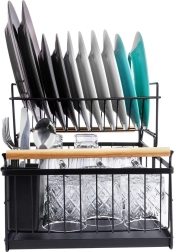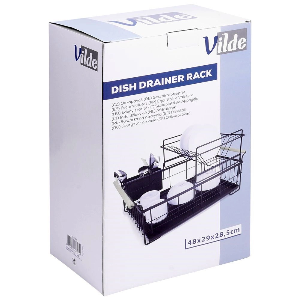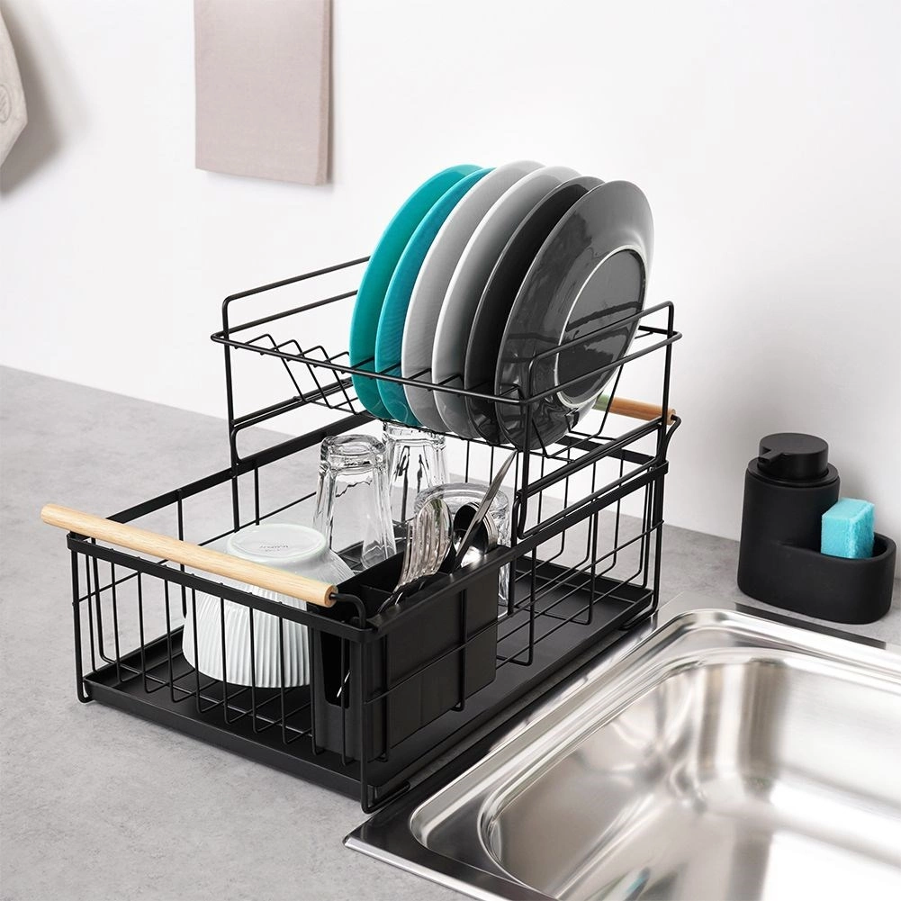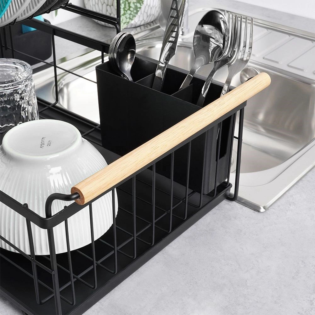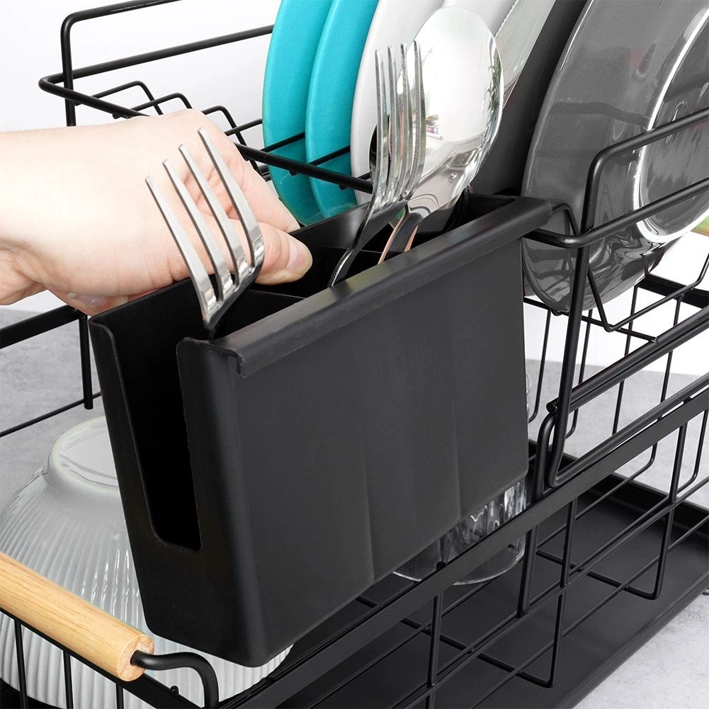 Elegantus dviejų aukštų indų džiovintuvas juodos spalvos taupo vietą ir palaiko virtuvinį paviršių sausą bei tvarkingą. Jame yra išimamas varvėjimo padėklas, dviejų kamerų stalo įrankių krepšelis ir patogios bambukinės rankenos lengvam nešiojimui. Pagamintas iš patvaraus metalo, turi vietos lėkštėms, dubenėliams, stiklinėms ir stalo įrankiams, puikiai tinka interjerui industrinio stiliaus. Dviejų lygių konstrukcija padidina talpą ir pagreitina indų džiovinimą.