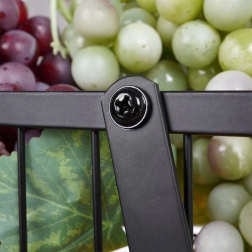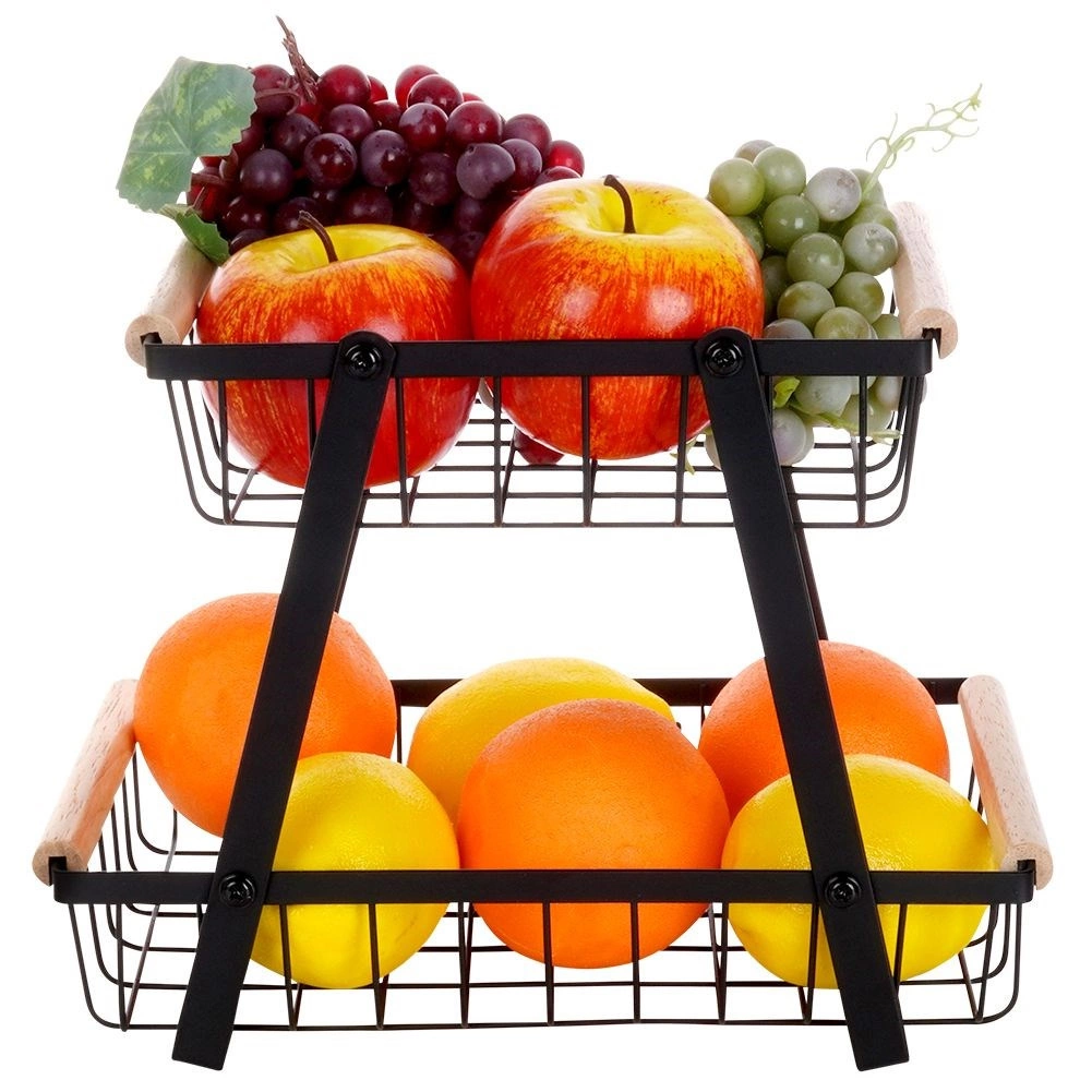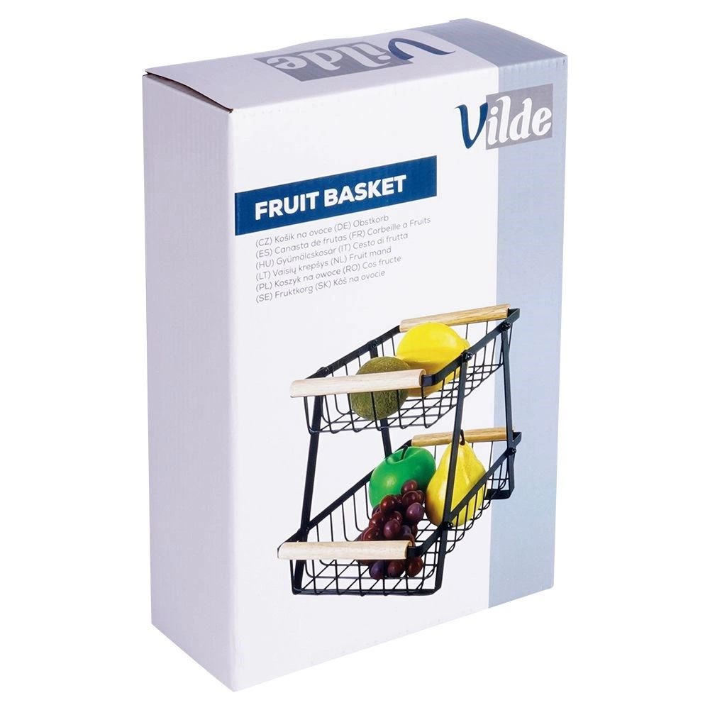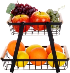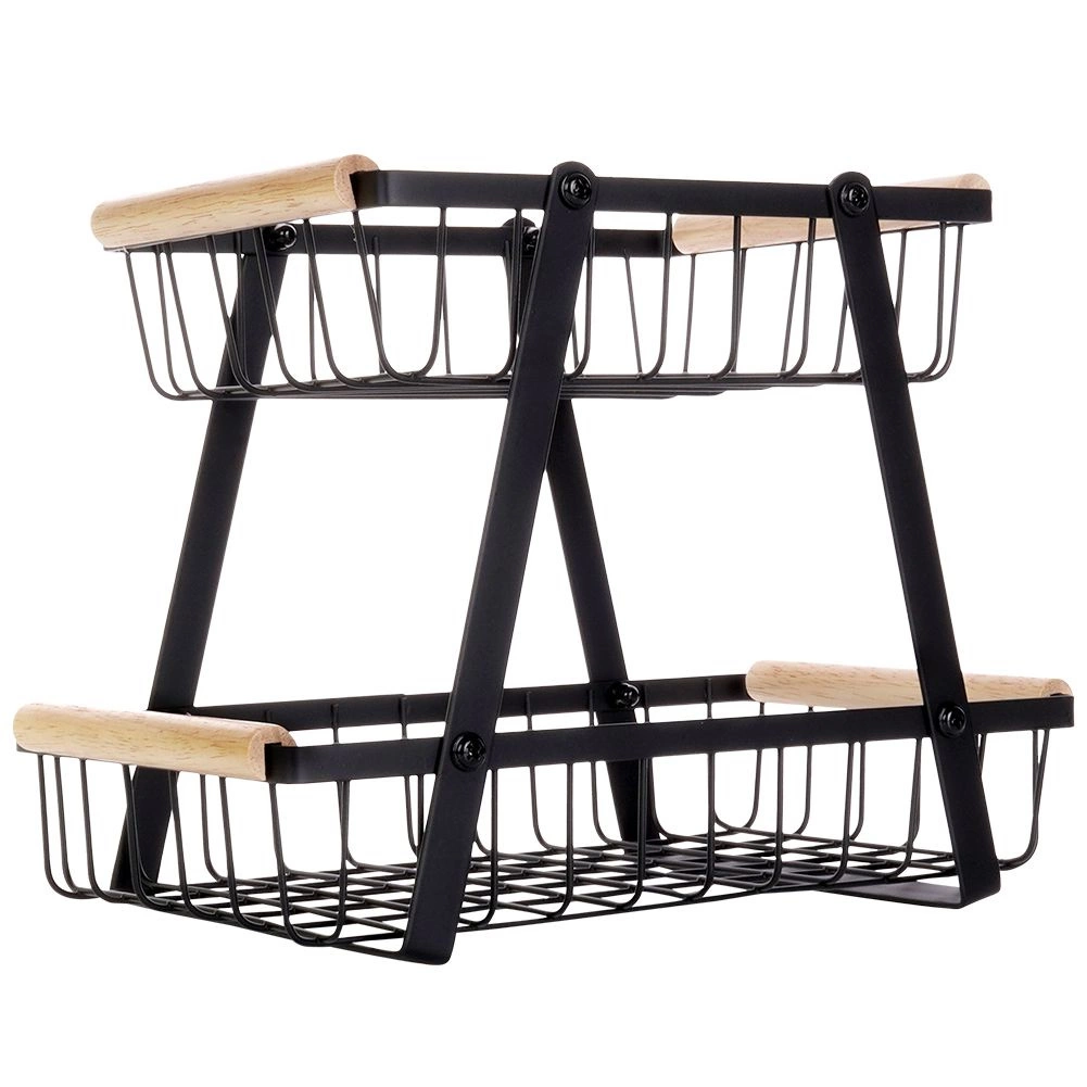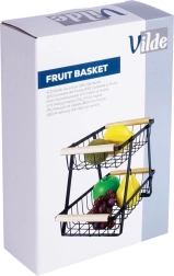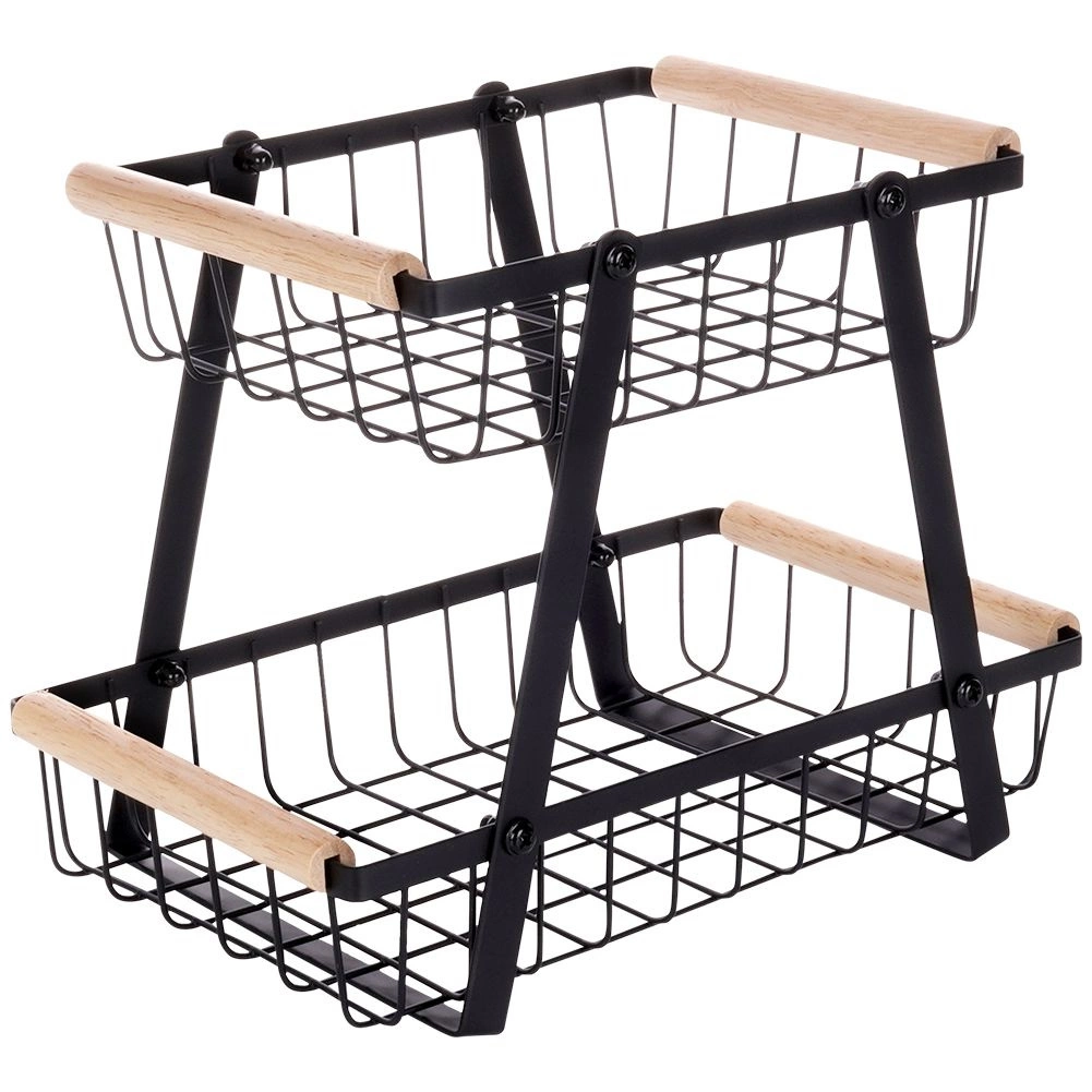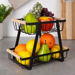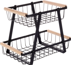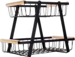 Šis dviaukštis metalinis organizatorius dera modernią industrinę išvaizdą su aukštu funkcionalumu. Atviros vielinės sienelės užtikrina optimalų oro srautą, todėl vaisiai ir daržovės ilgiau išlieka švieži. Medinės rankenos garantuoja patogų nešimą, o dėl tvirtos konstrukcijos visas stovas yra patvarus ir stabilus.
