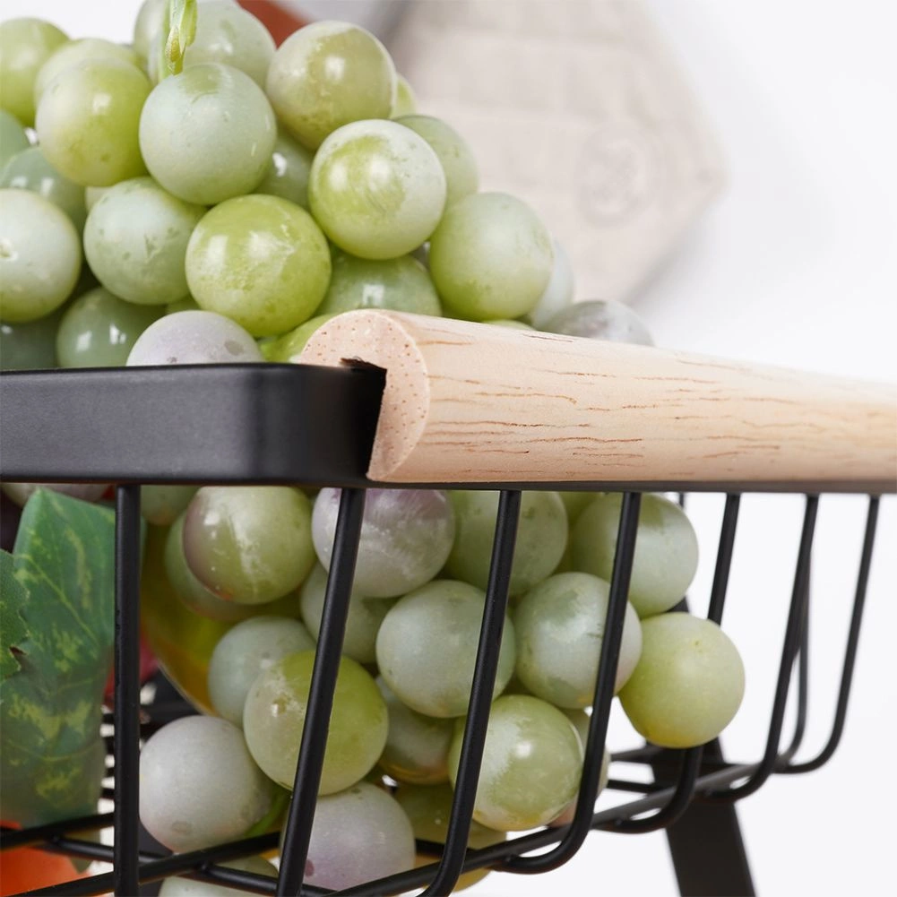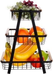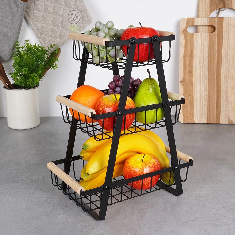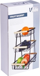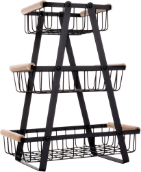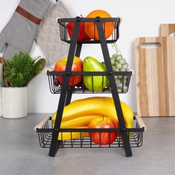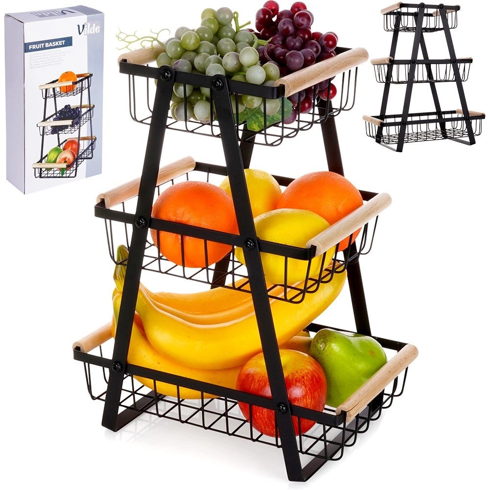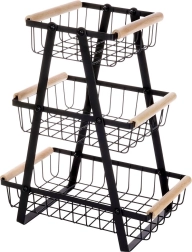 Šis trijų aukštų vaisių ir daržovių stovas siūlo sumanų vertikalų laikymą, todėl taupo vietą ant stalviršio ir sandėliuke. Atviri krepšiai užtikrina geresnę oro tėkmę, dėl kurios maistas ilgiau išlieka šviežias ir visada matomas. Tvirtą matinės juodos spalvos metalą papildo malonios medinės rankenos patogiam naudojimui.
