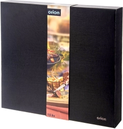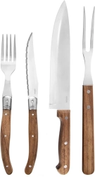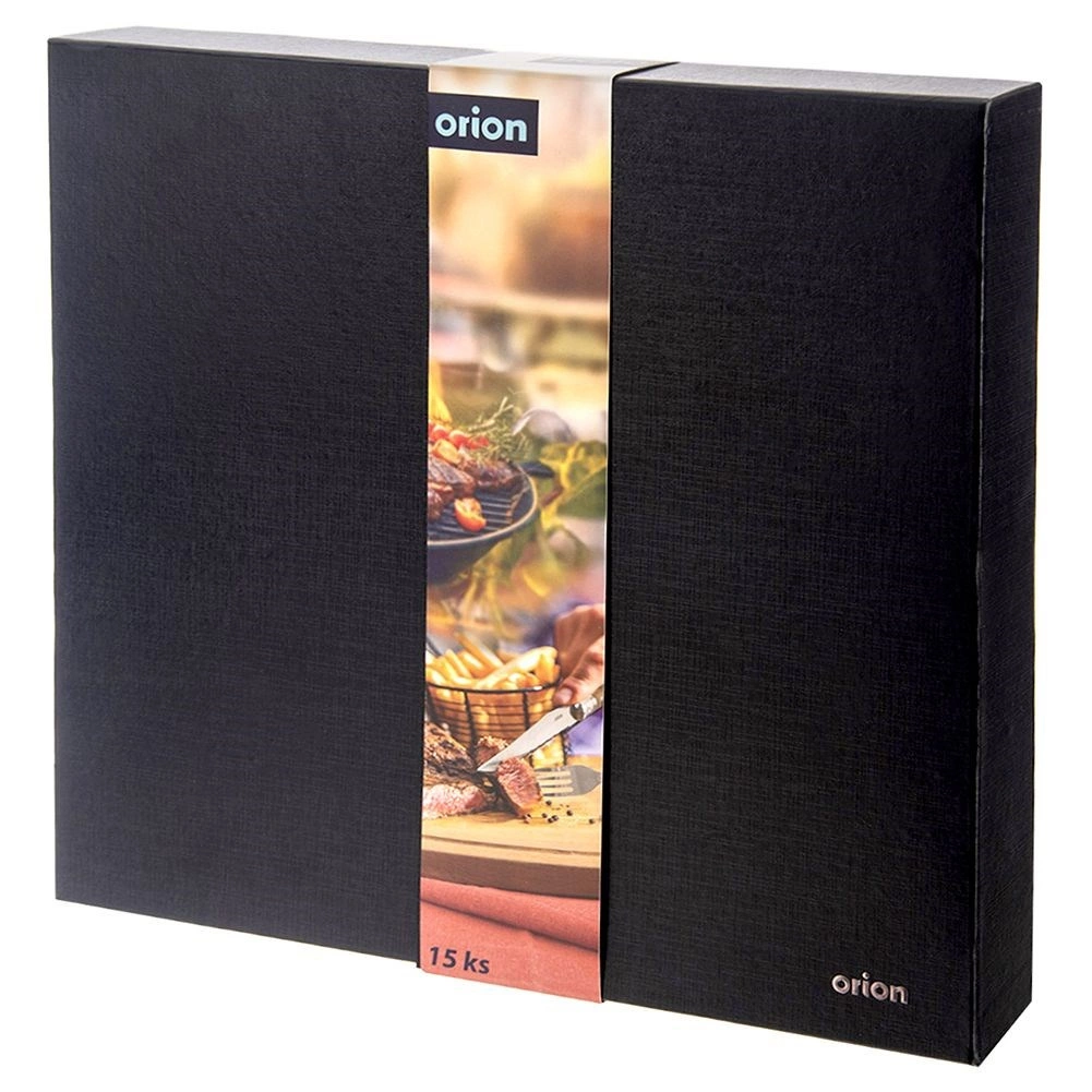 - 6× šakutė (22 cm), 6× kepsnių peilis (23 cm, geležtė 11 cm), 1× virėjo peilis (33 cm, geležtė 21 cm), 1× mėsos šakutė (33 cm), 1× lentelė (37 × 23 × 1,5 cm)