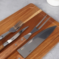 Komplekte yra tvirta akacijos medienos pjaustymo ir patiekimo lentelė. Rinkinys supakuotas į elegantišką dovanų dėžutę, todėl tai puiki dovanos idėja. Naudokite namuose, prie grilio ir HoReCa sektoriuje.