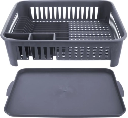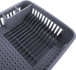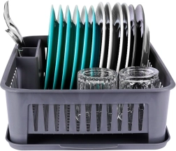 Džiovyklė talpina iki 12 lėkščių, turi vietos dubeniams, puodeliams ir stiklinėms bei dvikamerį stalo įrankių laikiklį tvarkingam suskirstymui. Neutrali pilka spalva lengvai dera prie bet kokio virtuvės stiliaus, o priežiūra paprasta – pakanka išimti padėklą ir praskalauti.