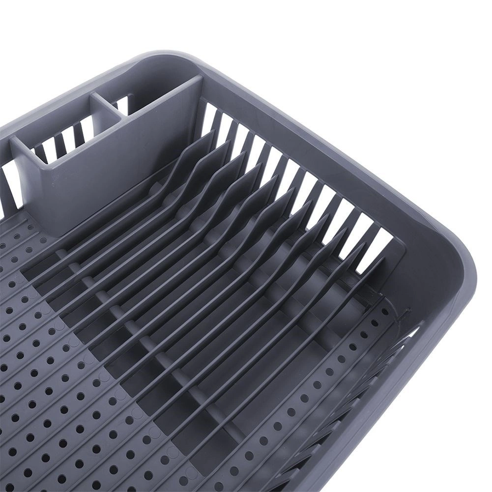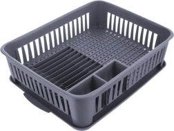 Praktiška pilka indų džiovyklė, kurios matmenys 43,5 × 32 × 12 cm, padės išlaikyti virtuvės kriauklę ir stalviršį sausą bei tvarkingą. Talpina iki 12 lėkščių, turi vietos puodeliams ir stiklinėms bei du skyrius stalo įrankiams. Dėl išimamo lašėjimo padėklo lengva valyti, ji lengva ir patvari – ideali tiek moderniai, tiek klasikinei virtuvei.