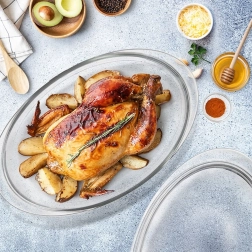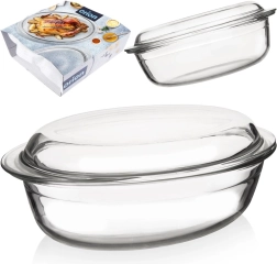 Įvaldykite namų kepimą su ovaliu stikliniu indu su dangčiu, kurio talpa 3 l. Pagamintas iš borosilikatinio stiklo, atsparus temperatūrai nuo -20 °C iki +300 °C, tinkamas orkaitėms ir mikrobangų krosnelėms, su paprastu plovimu indaplovėje. Abi dalis galima naudoti atskirai arba kartu – dangtį galima naudoti kaip antrą kepimo indą.