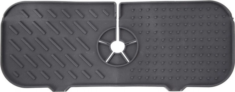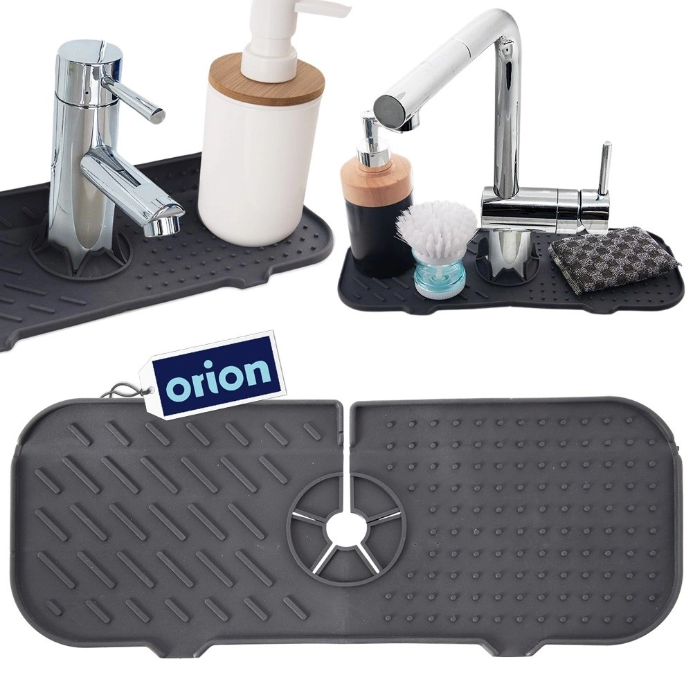 Praktiškas silikoninis kilimėlis prie kriauklės, 36 × 14 cm, palaiko sausą sritį aplink maišytuvą ir stalviršį. Dėl centrinės išpjovos puikiai tinka daugumai čiaupų, veikia kaip lašėjimo padėklas kempinėlėms ir indų priežiūros priemonėms, saugo paviršių nuo drėgmės ir kalkių nuosėdų. Pagamintas iš patvaraus silikono, lengvai valomas ir tinkamas plauti indaplovėje. Neslystantis paviršius, greitas vandens nutekėjimas ir ilgaamžiškumas.