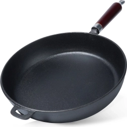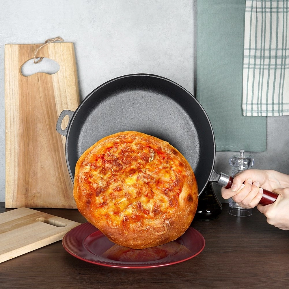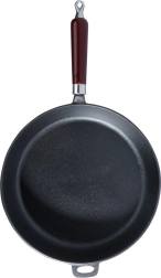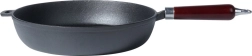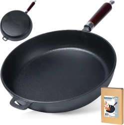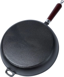 Universalioji ketaus keptuvė, 30 cm skersmens, kasdieniam gaminimui namuose ir lauke. Dėl masyvios konstrukcijos puikiai perduoda ir sulaiko šilumą, turi aukštus kraštus, ergonomišką medinę rankeną ir pagalbinę auselę saugiam nešiojimui. Tinka indukcijai, dujinei, elektrinei, stiklo keramikinei, halogeninei kaitvietei ir orkaitei nuėmus rankeną.