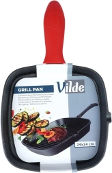 Kvadratinė ketaus grilinimo keptuvė su patogia raudona silikonine rankenos mova saugiam pernešimui. Užtikrina greitą ir tolygų įkaitimą, didelę šilumos akumuliaciją ir briaunuotą paviršių autentiškoms grotelių žymėms bei riebalų nutekėjimui. Tinka dujinei, elektrinei, keraminei, halogeninei ir indukcinei kaitvietei, orkaitei, taip pat atvirai ugniai ar griliui.