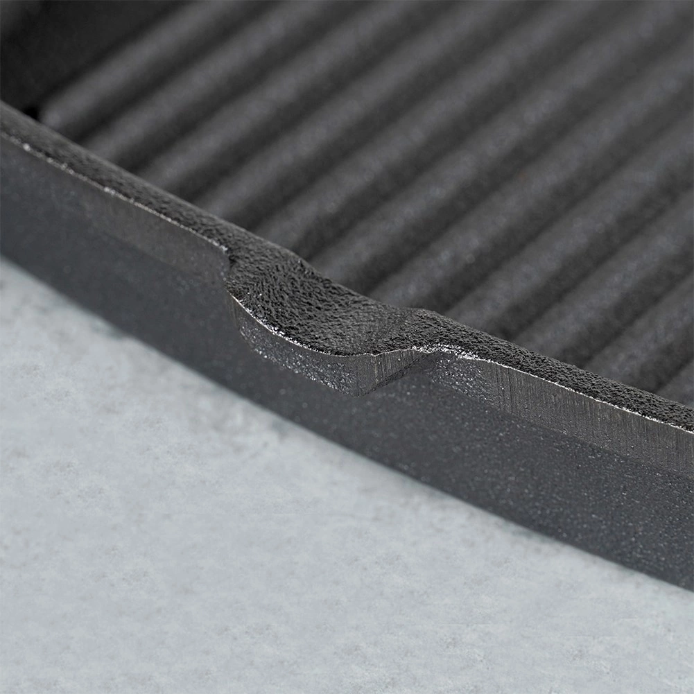 Aukštesnės briaunos sukuria ryškias grilinimo juosteles ir nukreipia riebalus. Integruoti snapeliai palengvina sulčių ir riebalų nupylimą.