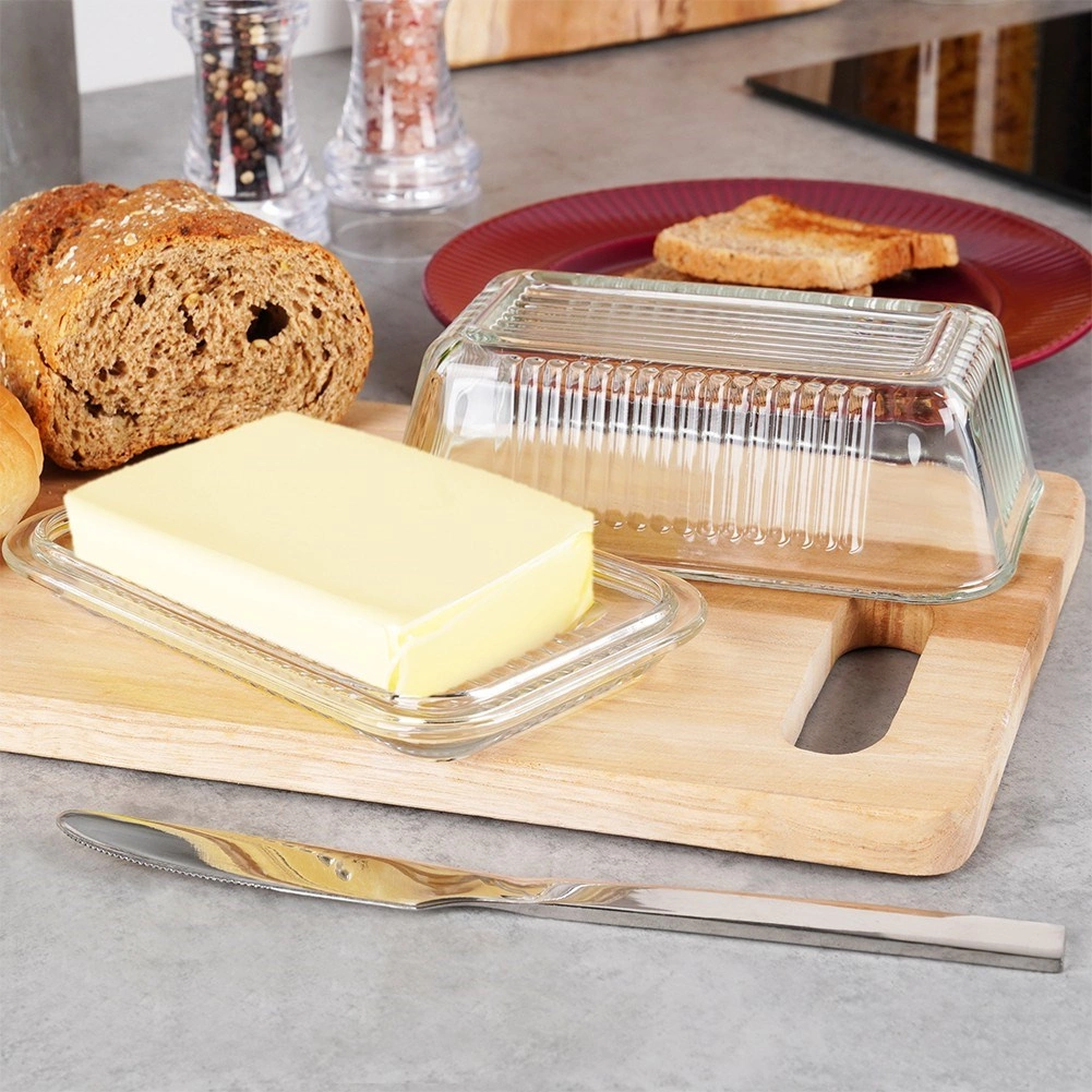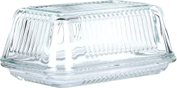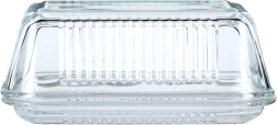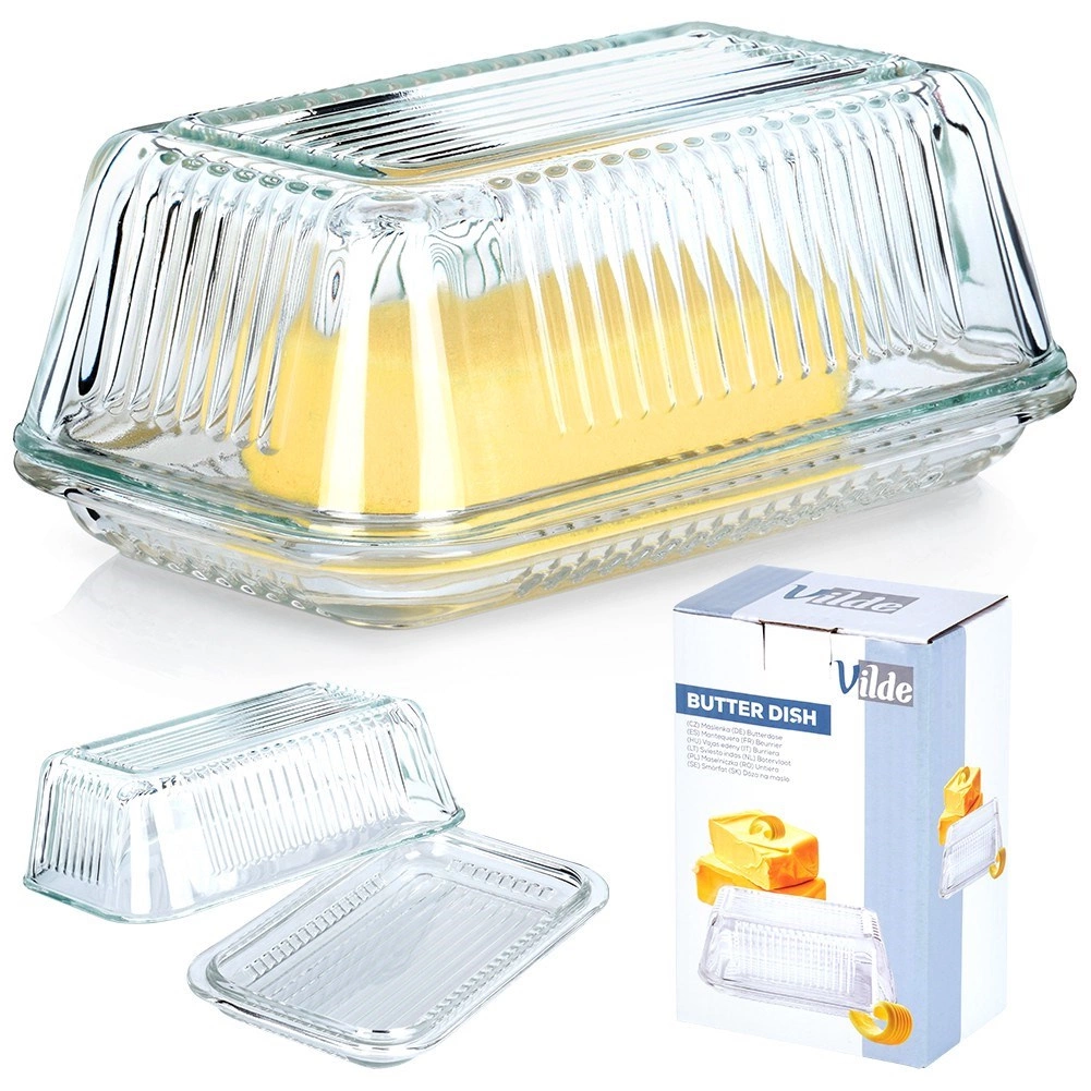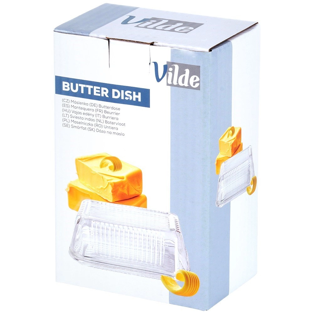 Elegantiška stiklinė sviestinė Vilde su klasikine forma ir gofruotu dizainu išlaiko sviestą šviežią ir estetiškai patiekiamą. Pagaminta iš aukštos kokybės, tvirto skaidraus stiklo, turi praktišką dangtį, kuris saugo nuo kvapų ir nešvarumų, o dėl permatomos medžiagos lengvai matysite likusį kiekį. Tinka plauti indaplovėje.