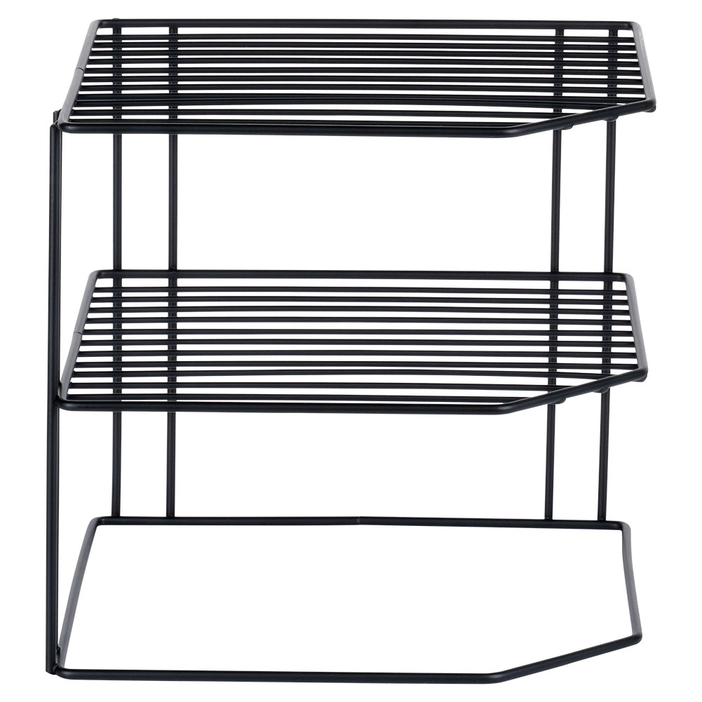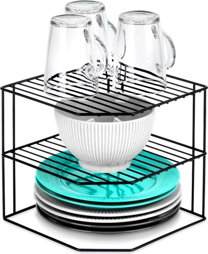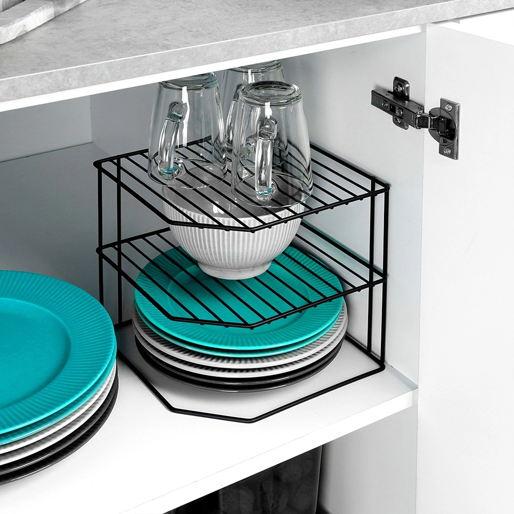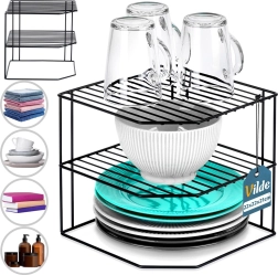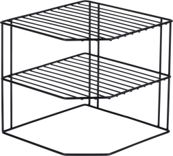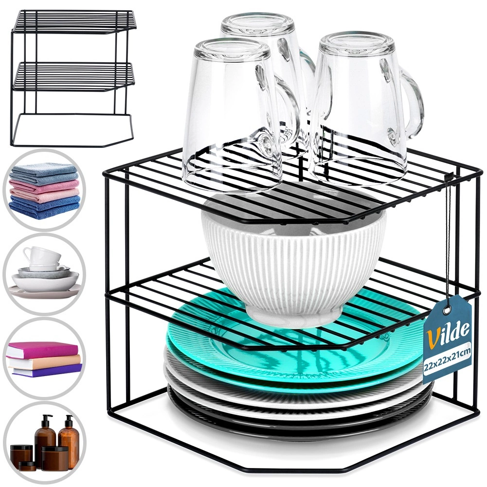 Ši kampinė virtuvinė lentyna, kurios matmenys 22 × 22 × 21 cm, efektyviai padalija spintelės erdvę į tris aukštus, todėl patogiau sudėsite lėkštes, dubenėlius, stiklines ir maisto produktus. Atvira vielinė konstrukcija užtikrina vėdinimą ir aiškų matomumą, o juodos spalvos miltelinis dažymas suteikia elegantišką išvaizdą ir atsparumą dilimui.