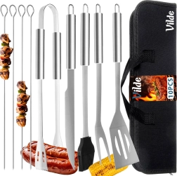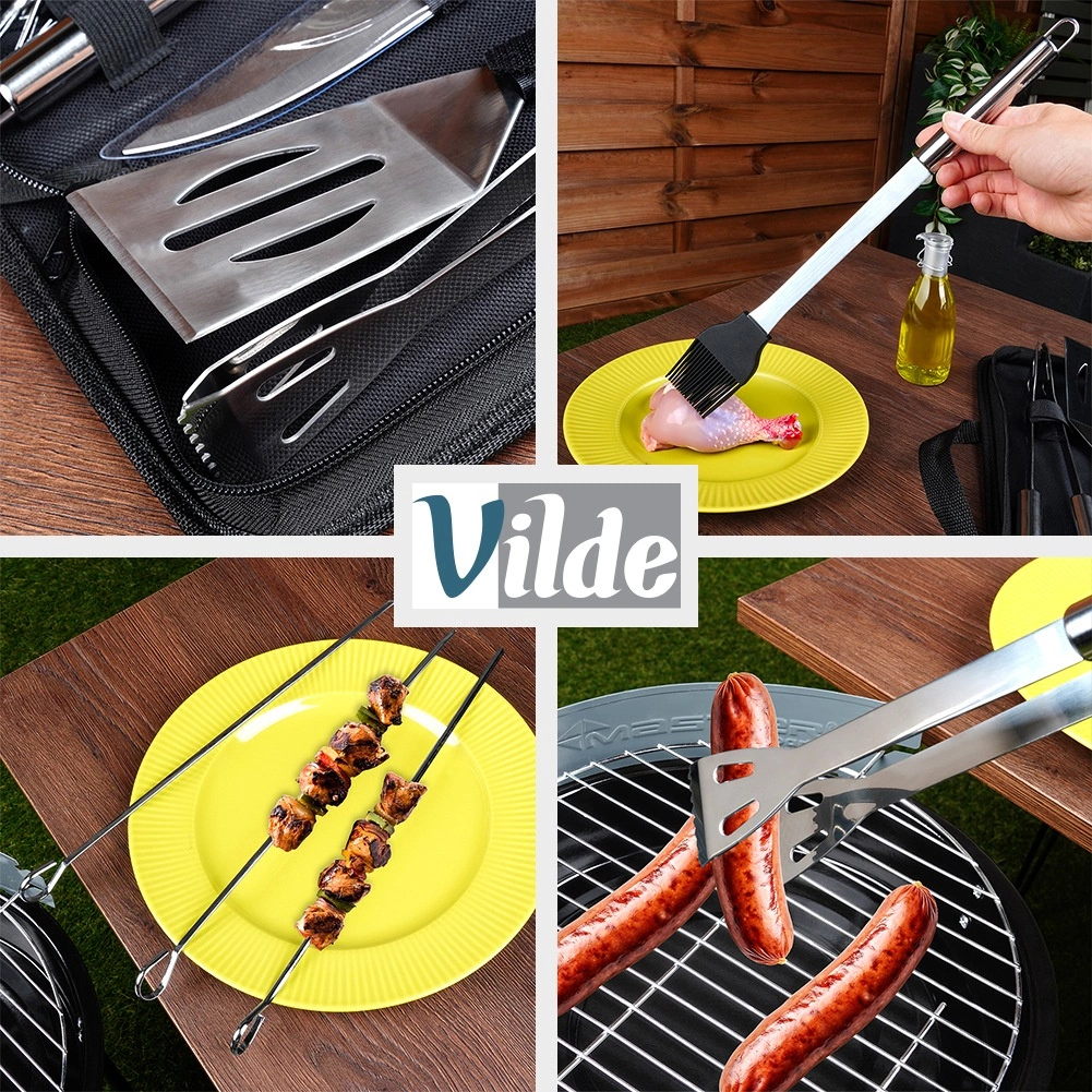Pilnas griliui skirtas rinkinys su patvariu dėklu – viskas, ko reikia gardiems patiekalams ruošti ant grotelių ir virtuvėje. Nerūdijančio plieno įrankiai su ilgomis rankenomis užtikrina saugų ir patogų valdymą, silikoninis teptukas lengvam marinavimui bei iešmeliai vėrinukams. Praktiškas užtraukiamas dėklas viską laiko tvarkingai sudėtą ir paruoštą naudoti namuose ir kelionėse.