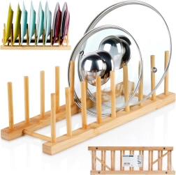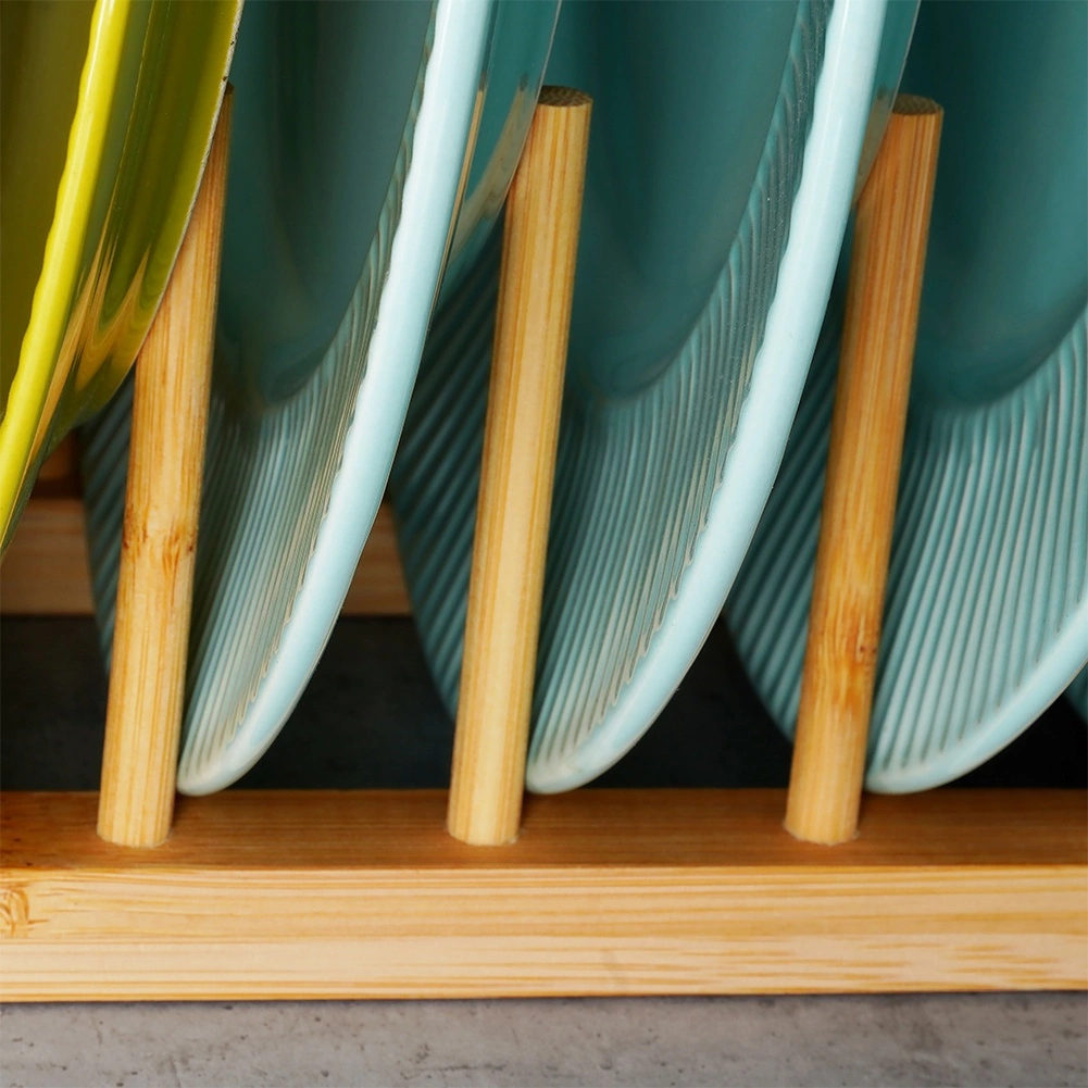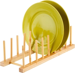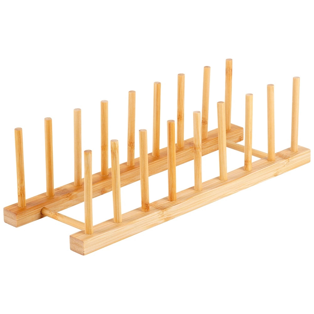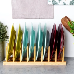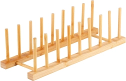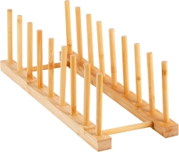 Šis universalus natūralaus bambuko stovas padės palaikyti tvarką ant virtuvės stalviršio, stalčiuje ar spintelėje. Dėl apgalvoto kaiščių išdėstymo jis patikimai atskiria dangčius, negilias ir gilesnes lėkštes (pagal jų profilį) bei pjaustymo lenteles. Natūrali medžiaga su lygiu paviršiumi saugo indus nuo subraižymo ir kartu užtikrina gerą oro cirkuliaciją.