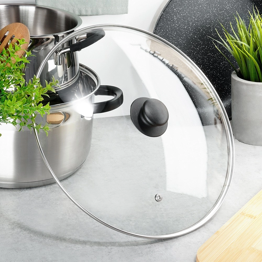 Šis universalus stiklinis dangtis puikiai tinka puodams, keptuvėms ir troškintuvams, kurių skersmuo 32 cm. Dėl skaidraus karščiui atsparaus stiklo visada matysite gaminimo eigą nekeldami dangčio, taip taupysite energiją ir laiką. Nerūdijančio plieno kraštas užtikrina ilgaamžiškumą, o aukštas rantelis prisideda prie tvirto ir sandaraus prigludimo prie indo.