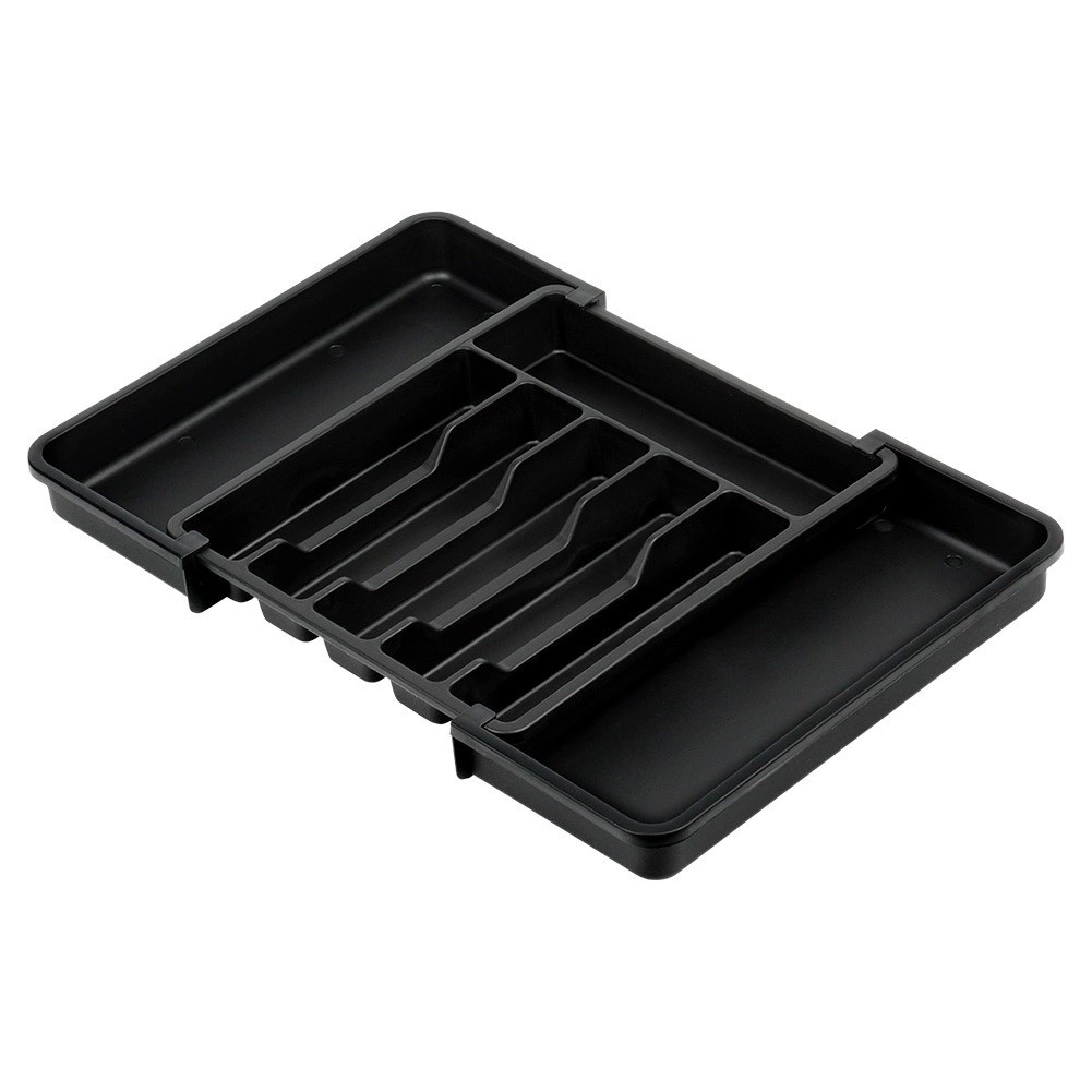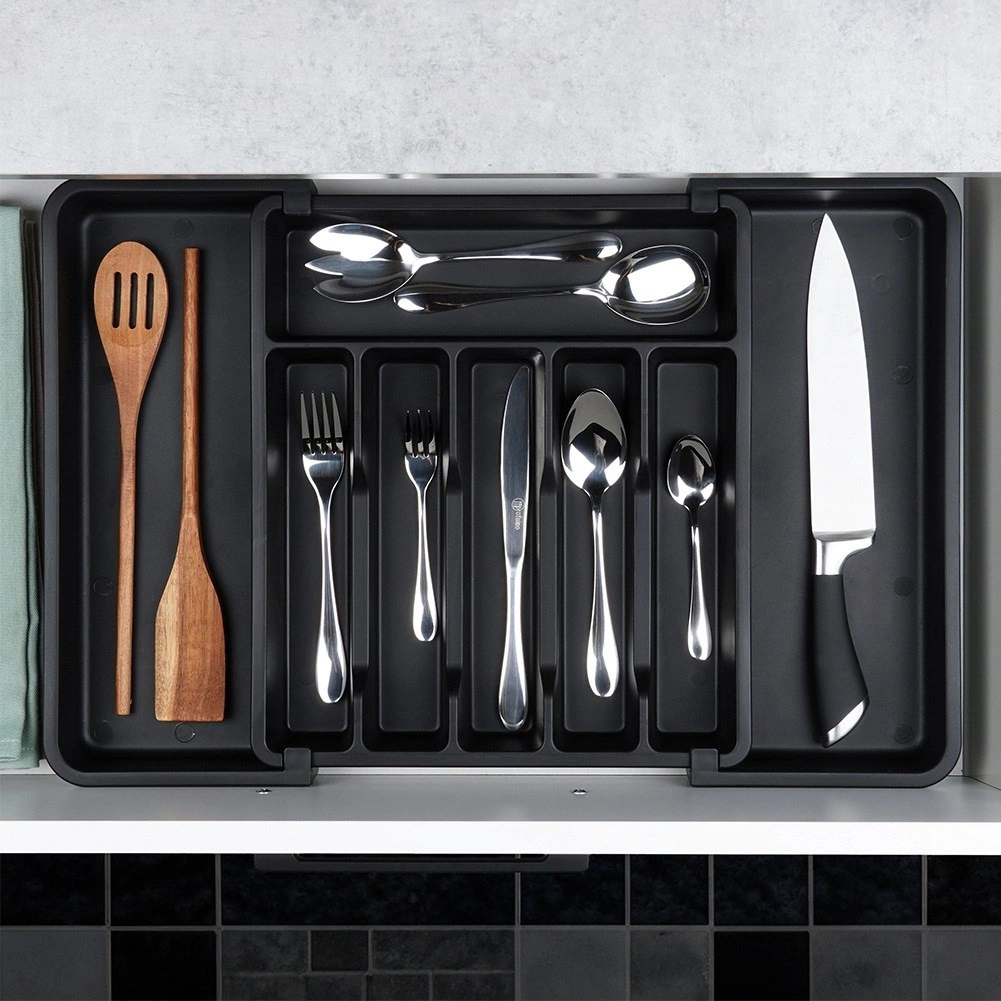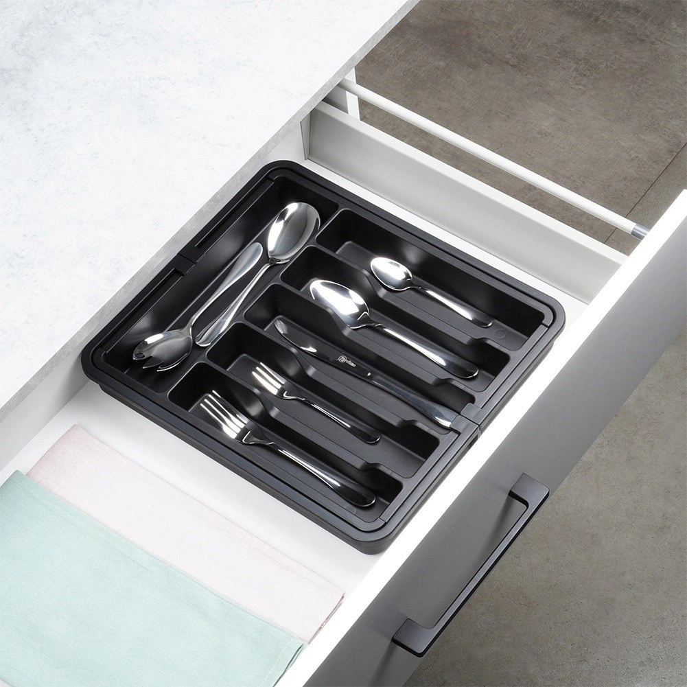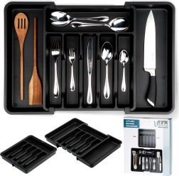Praktiškas išplečiamas stalčiaus organizatorius padės visada tvarkingai laikyti jūsų stalo įrankius ir virtuvės reikmenis. Dėl plotio, reguliuojamo nuo 33 iki 56,5 cm, jis lengvai prisitaiko prie daugumos stalčių, turi daug skyrių peiliams, šakutėms, šaukštams ir mentelėms, o pagamintas iš patvaraus plastiko elegantiškos juodos spalvos – ilgaamžiškumui ir lengvai priežiūrai.