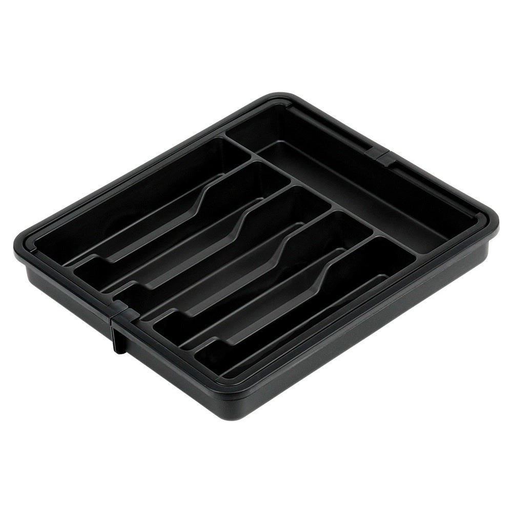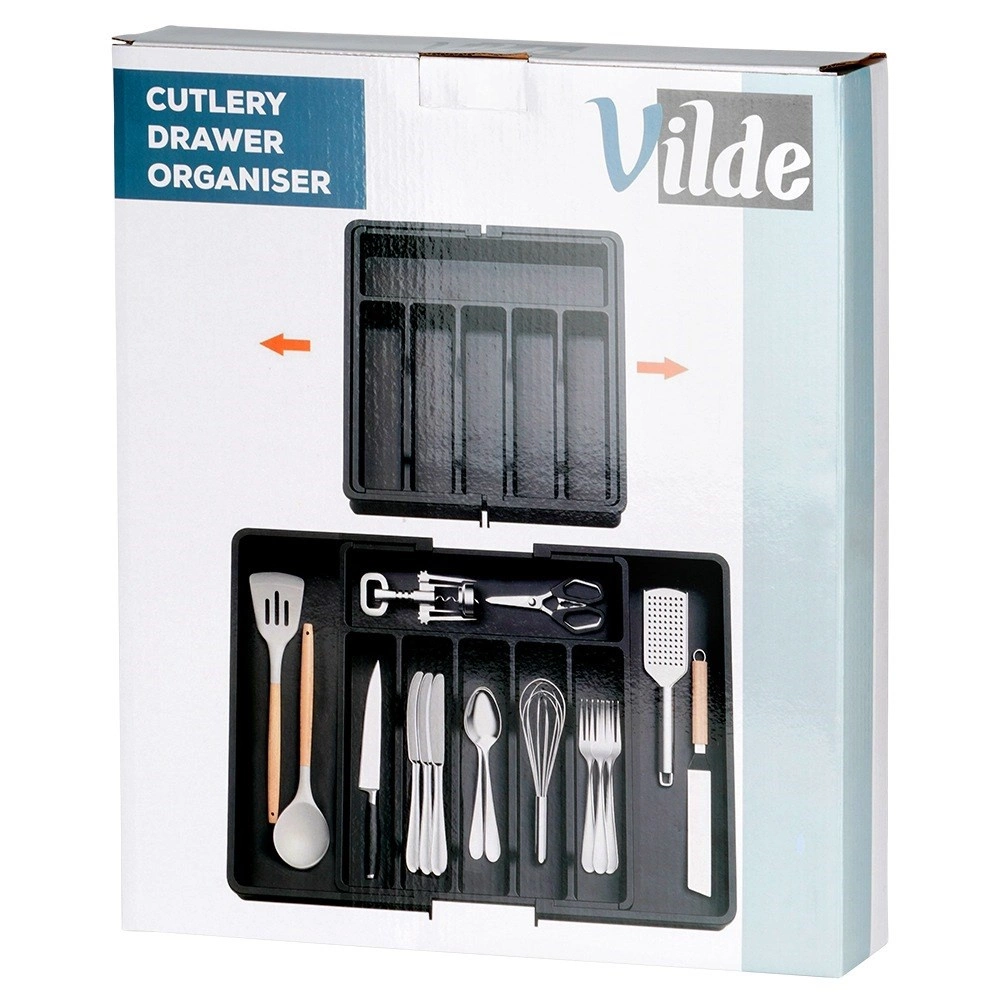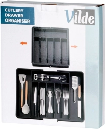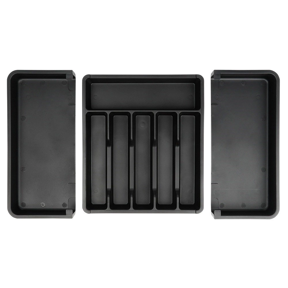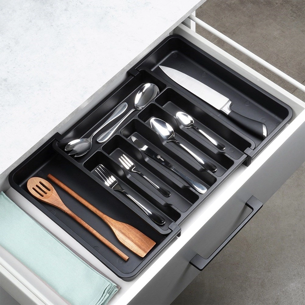 Praktiškas išplečiamas stalčiaus organizatorius padės visada tvarkingai laikyti jūsų stalo įrankius ir virtuvės reikmenis. Dėl plotio, reguliuojamo nuo 33 iki 56,5 cm, jis lengvai prisitaiko prie daugumos stalčių, turi daug skyrių peiliams, šakutėms, šaukštams ir mentelėms, o pagamintas iš patvaraus plastiko elegantiškos juodos spalvos – ilgaamžiškumui ir lengvai priežiūrai.
