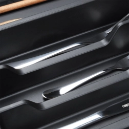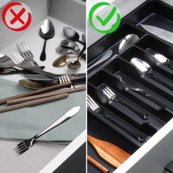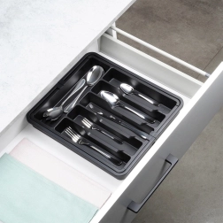 Sutvarkykite virtuvę kartą ir visiems laikams. Išplečiama konstrukcija leidžia sklandžiai praplatinti iki 56,5 cm, todėl įdėklas tiksliai tinka įvairaus pločio stalčiams. Segmentuoti skyriai užtikrina saugų ir higienišką stalo įrankių, peilių ir virtuvės priemonių laikymą – viskas visada bus po ranka.