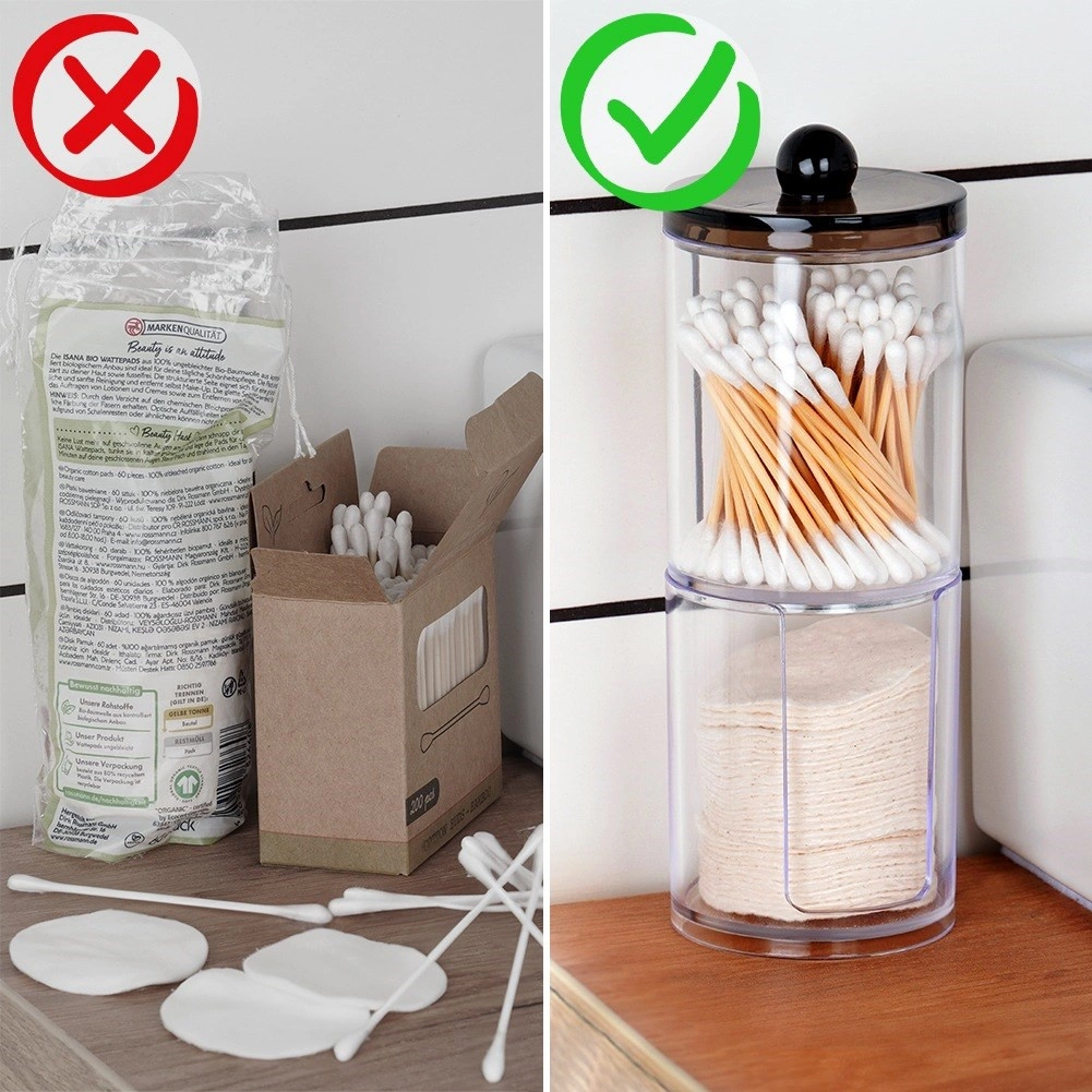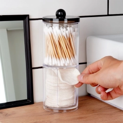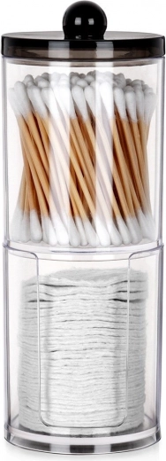 Viršutinė dalis skirta vatos pagaliukams, apatinė – kosmetiniams diskeliams su lengvu padavimu. Maksimali tvarka minimalioje erdvėje.