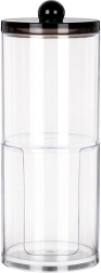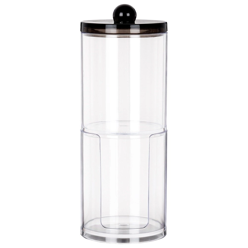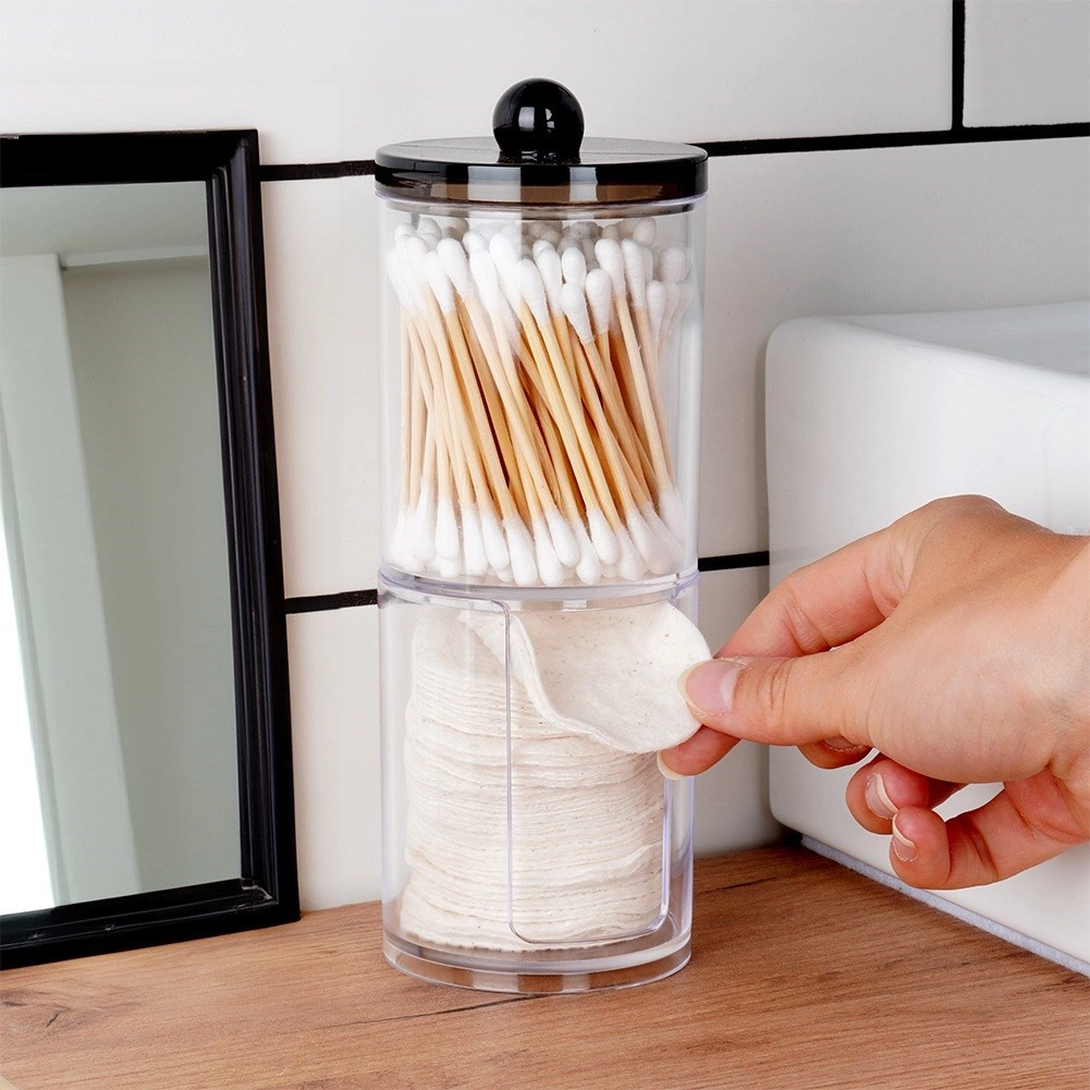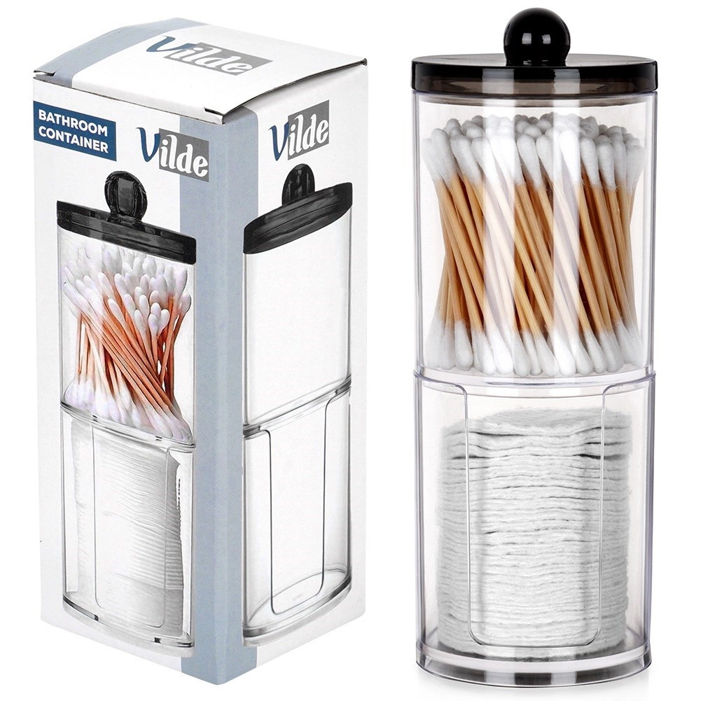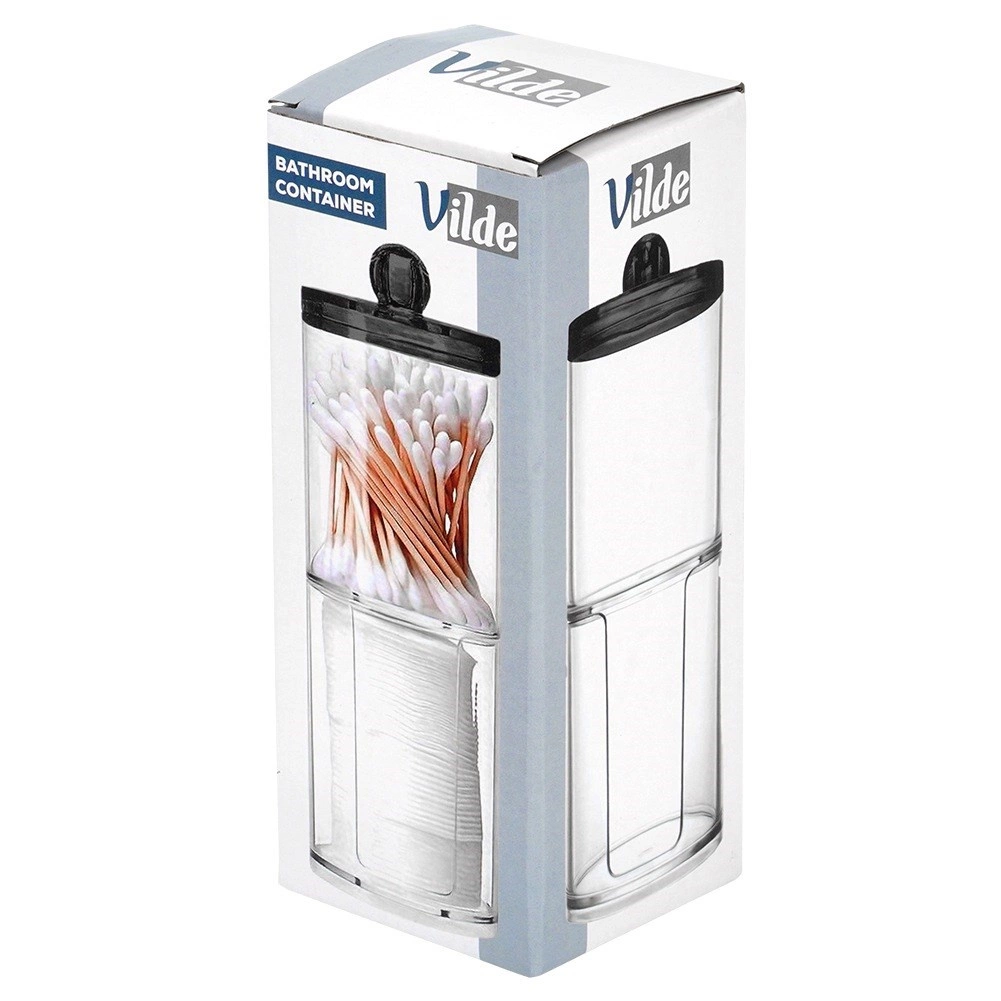 Šis elegantiškas dviaukštis dozatorius puikiai tinka kasdienei vonios rutinos tvarkai. Skaidrus dizainas leidžia akimirksniu įvertinti likutį, o sudedamas sprendimas taupo vietą lentynoje ir prie praustuvo. Viršutinė talpa skirta vatos pagaliukams, apatinė – apvaliems kosmetiniams diskeliams.