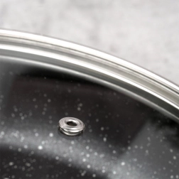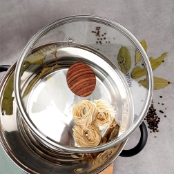 Universalus 24 cm skersmens stiklinis dangtis su tvirtu nerūdijančio plieno apvadu, patogiu medžio išvaizdos laikikliu ir garų išleidimo anga. Dėl karščiui atsparaus stiklo matysite gaminimą nekeldami dangčio, maistas išvirs greičiau, o virtuvė išliks be nereikalingo taškymosi.