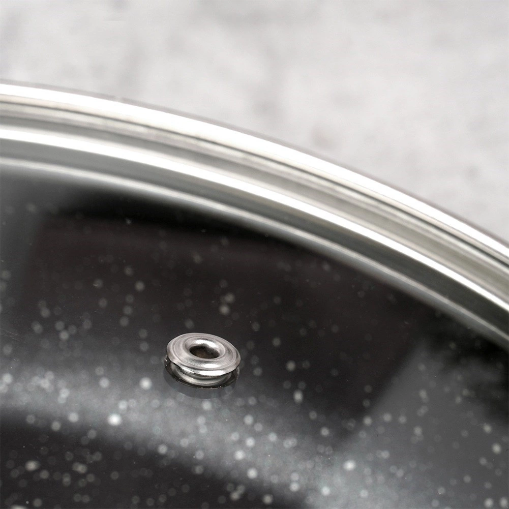 Tvirtas nerūdijančio plieno apvadas užtikrina ilgą tarnavimo laiką ir sandarų prigludimą prie indo krašto. Ergonomiška medžio imitacijos rankenėlė maloni liesti ir saugi naudojant. Integruota garų išleidimo anga patikimai pašalina perteklinius garus, o lengvai išgaubta forma skatina karšto oro cirkuliaciją.
