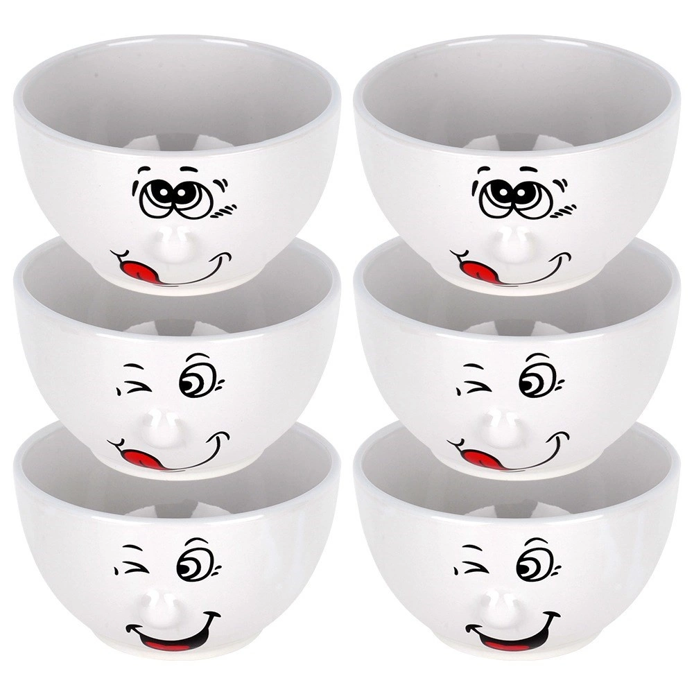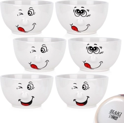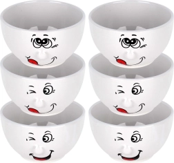 Pagyvinkite stalą su šiuo 6 baltų keramikinių dubenėlių rinkiniu, kurių talpa 550 ml ir skersmuo 13,5 cm. Kiekvienas dubenėlis turi žaismingą besišypsančio veido motyvą, yra tinkamas plauti indaplovėje ir naudoti mikrobangų krosnelėje bei puikiai tinka sriuboms, dribsniams, jogurtui ir užkandžiams. Atspari keramika ir klasikinė forma užtikrina ilgaamžiškumą ir gražią išvaizdą bet kokia proga.