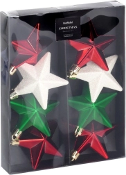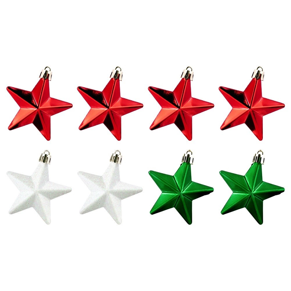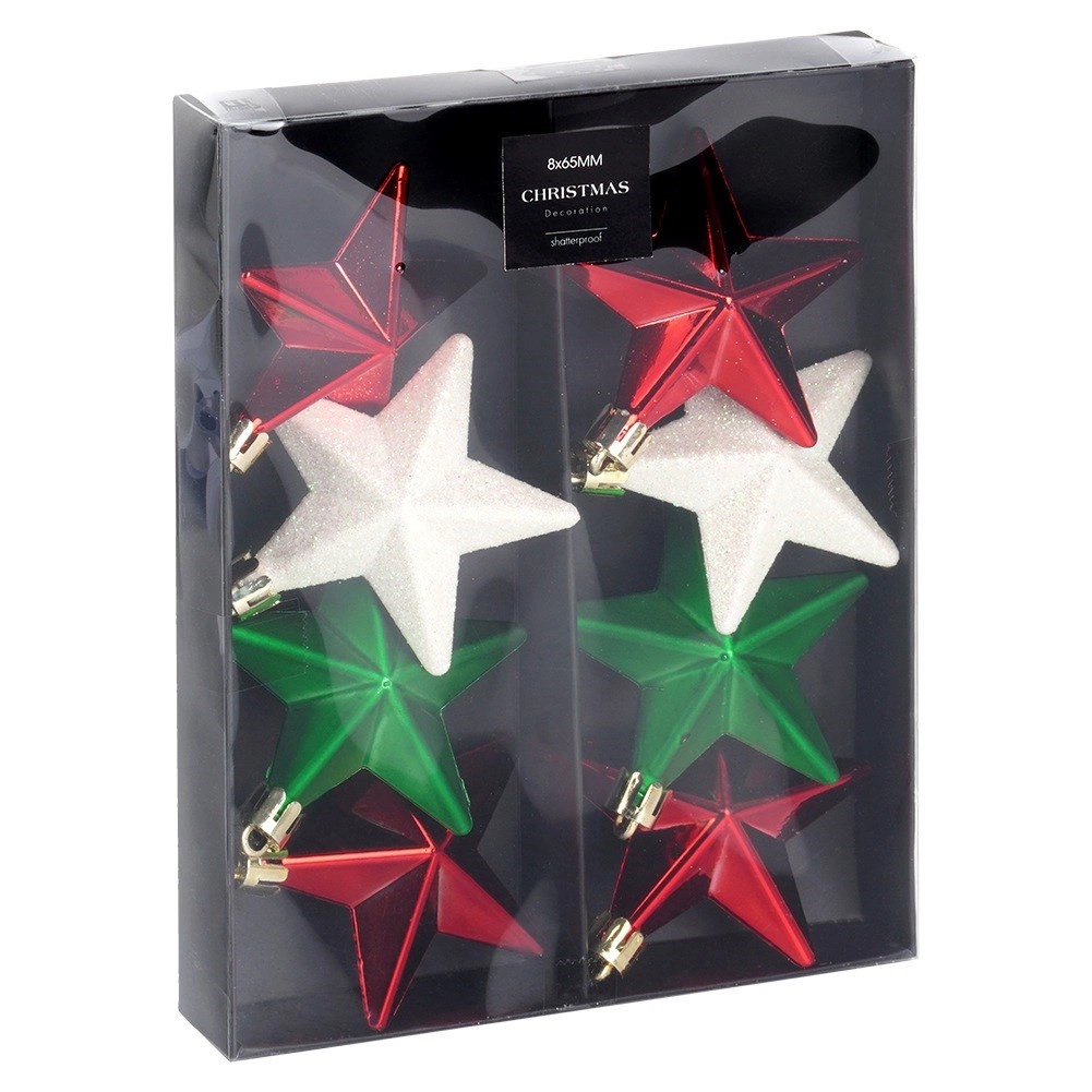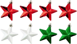 Stilingas 8 nesudaužomų kalėdinių žvaigždės formos dekoracijų rinkinys raudonos, žalios ir baltos spalvų su blizgiu, matiniu ir žėrinčiu paviršiumi. Žvaigždutės, kurių skersmuo 6,5 cm, suteiks jūsų puošybai klasikinio spindesio ir saugios elegancijos – idealu namams su vaikais ir augintiniais.