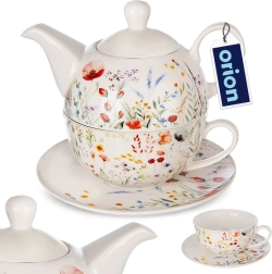 Elegantiškas porcelianinis tea-for-one rinkinys vienam arbatos mėgėjui sujungia arbatinuką 400 ml, puodelį 280 ml ir lėkštelę į kompaktišką, sandėliuojamą dizainą. Baltą porcelianą puošia spalvingi laukų žiedai, o arbatinukas turi praktišką dangtelį, padedantį išlaikyti gėrimo temperatūrą ir apsaugoti jį. Tinka indaplovei ir mikrobangų krosnelei – puiki idėja kaip stilinga dovana.