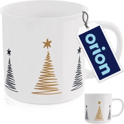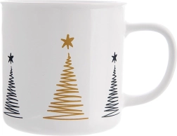 Stilingas keraminis puodelis, kurio talpa 500 ml, su minimalistinėmis kalėdinėmis eglutėmis juodos ir auksinės spalvos derinyje. Dėl patogios rankenėlės puodelį malonu laikyti, jis tinka indaplovei ir mikrobangų krosnelei ir idealiai tinka kavai, arbatai ir kakavai.