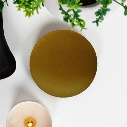 Elegantiškas metalinis žvakidės padėklas, kurio skersmuo 8,5 cm, matinės auksinės spalvos. Dėl trijų rutulinių kojelių jis yra stabilus, saugo paviršius nuo karščio ir vaško bei suteikia žvakėms stilingą pateikimą. Minimalistinis dizainas tinka moderniems interjerams ir taip pat gali būti naudojamas kaip dekoratyvinė lėkštelė smulkmenoms ar papuošalams.