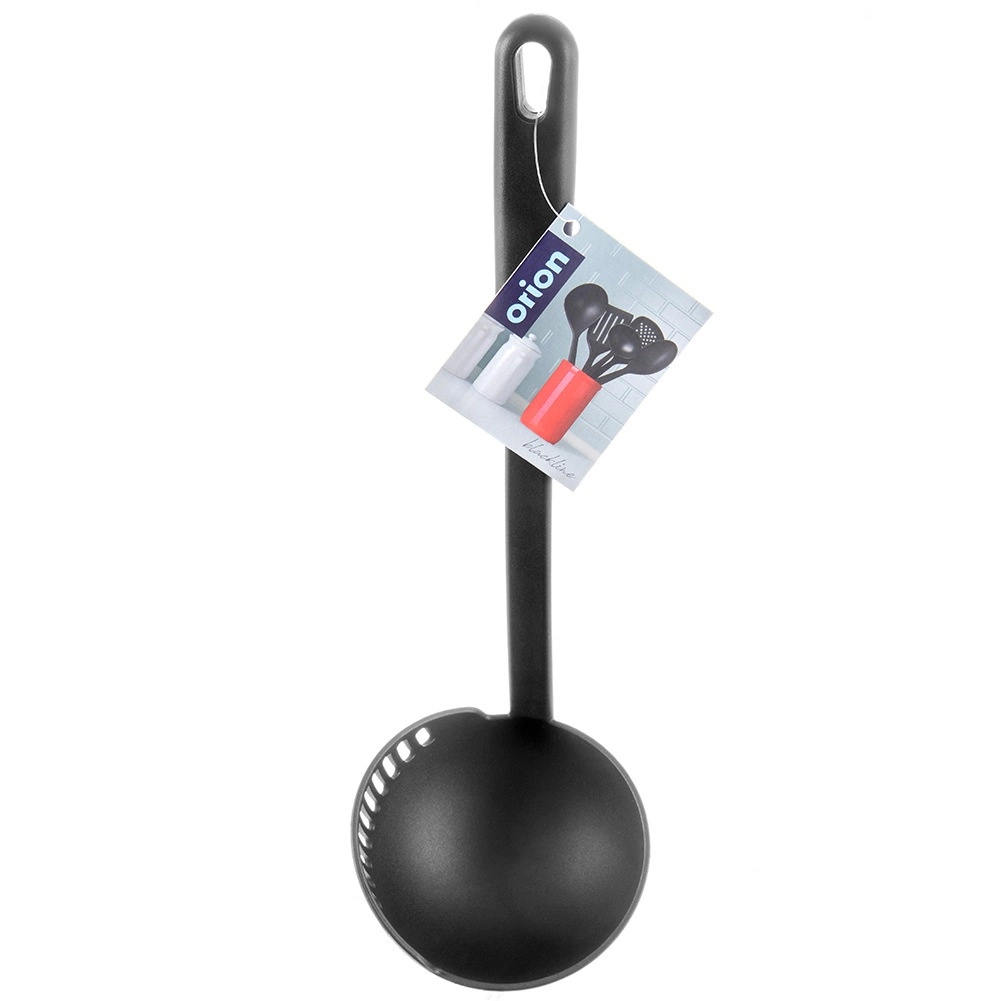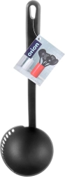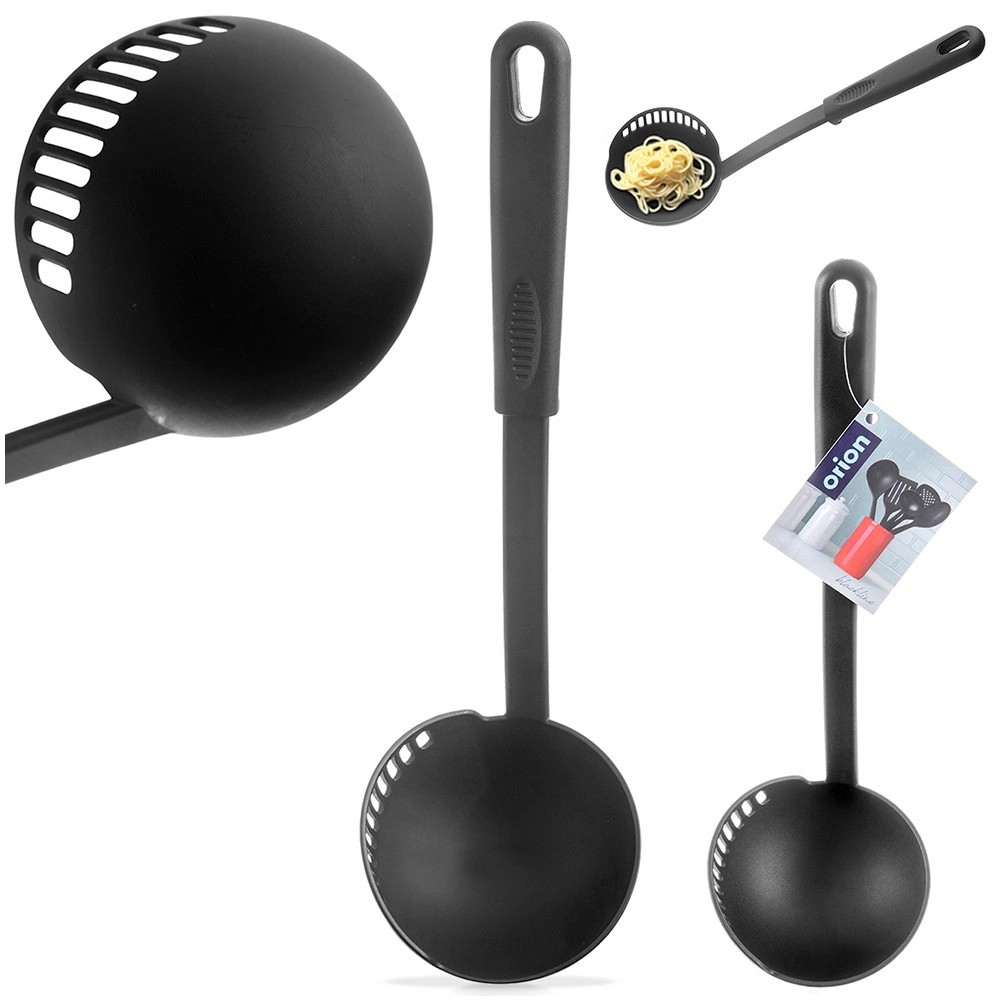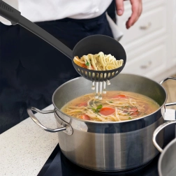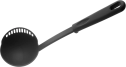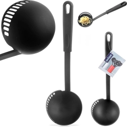 Praktiška virtuvinė samtuvė su integruota koštuvo briauna, 150 ml talpos ir 30,5 cm ilgio, idealiai tinka patiekti sriubas, padažus ar guliašą. Pagaminta iš lengvo, tvirto termoplasto elegantiškos juodos spalvos, švelni nelipniems paviršiams ir atspari temperatūrai iki 200 °C. Samtuvė iš BLACKLINE serijos siūlo lengvą koštimą, patogų patiekimą ir pakabinimo galimybę greitam laikymui. Tinka plauti indaplovėje.