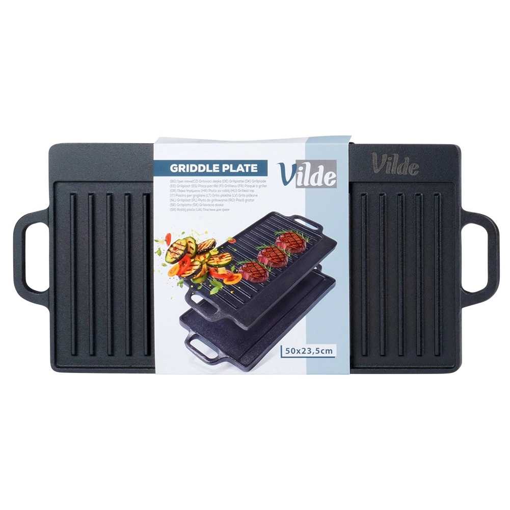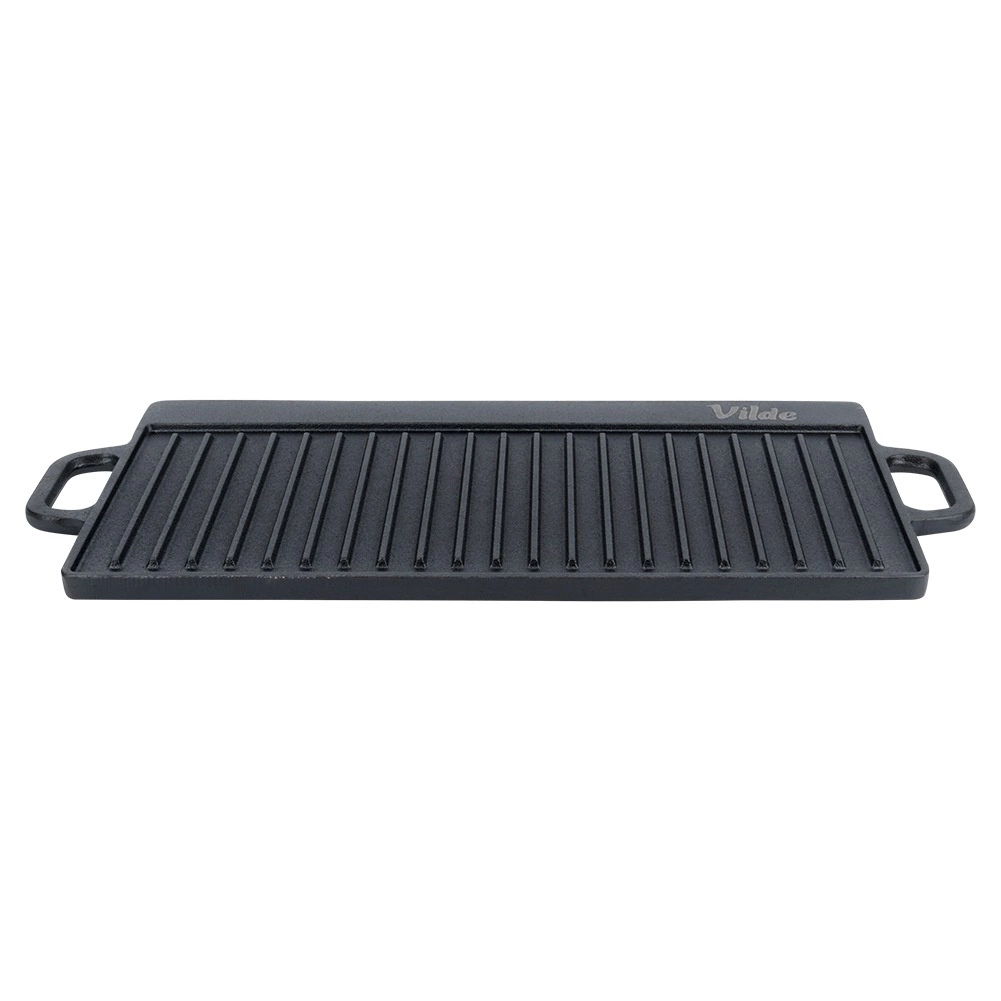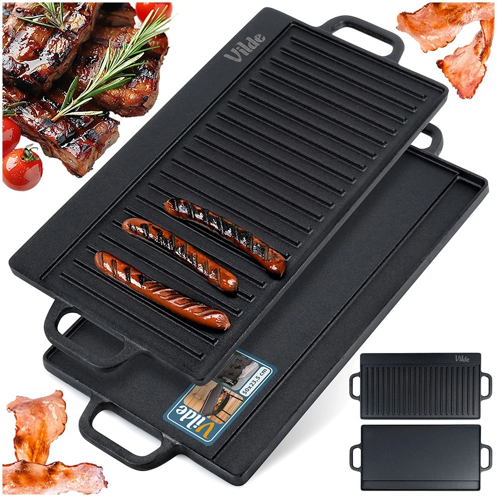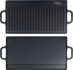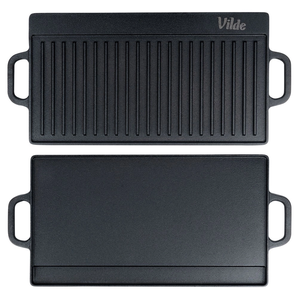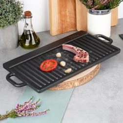 Universali dvipusė ketaus grilio plokštė CAST LINE, 50,5 × 23,5 cm, turi vieną briaunuotą ir vieną lygų paviršių, todėl puikiai tinka mėsai, žuviai, daržovėms ir steikams ruošti. Masyvus ketus puikiai paskirsto šilumą ir ją ilgai sulaiko, tad pasieksite tolygų apkepimą ir gražias sear juosteles. Tinka griliui, viryklei ir orkaitei.