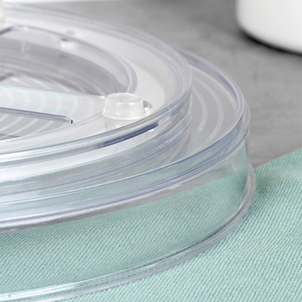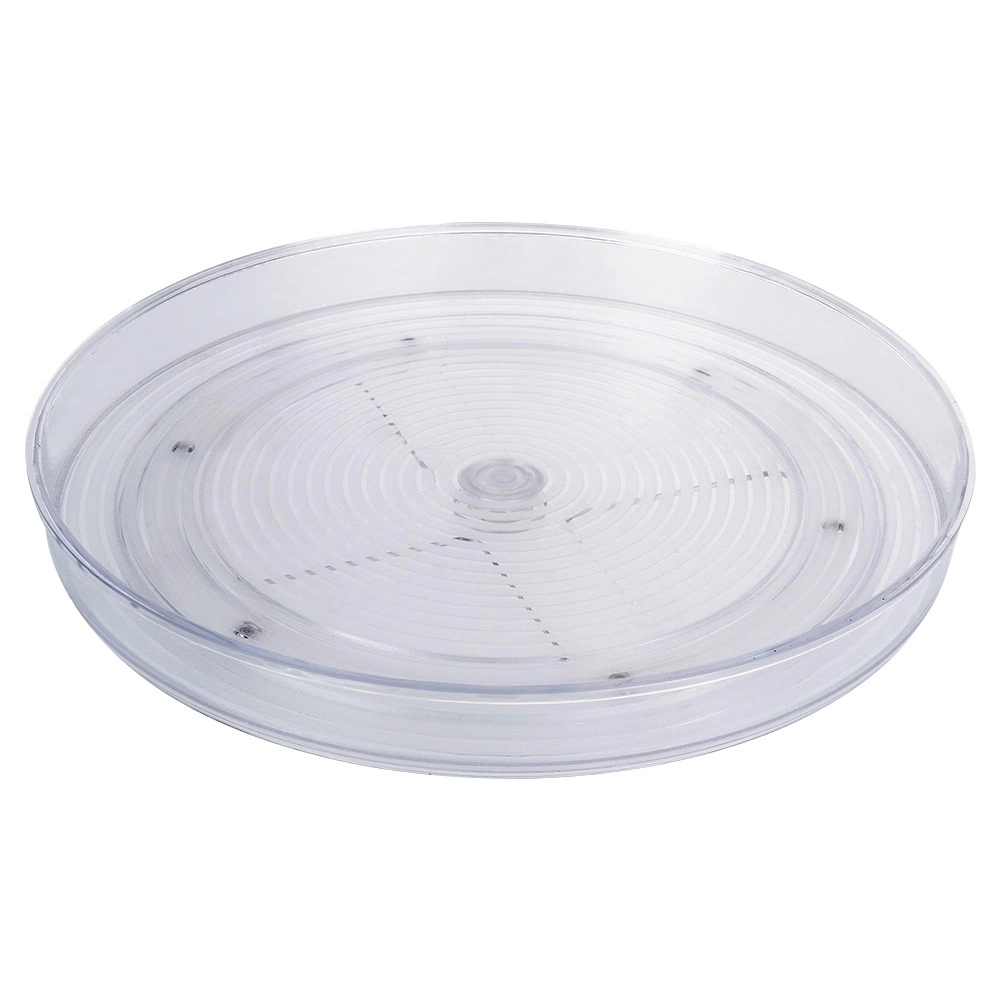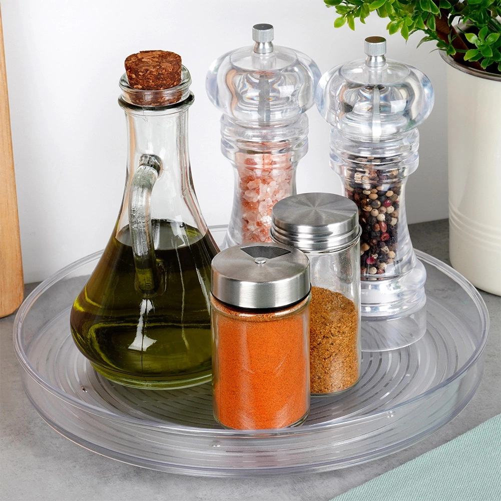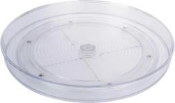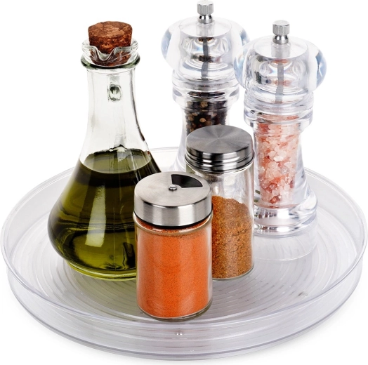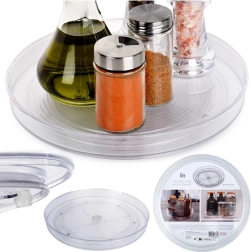 Lazy Susan tipo sukamasis padėklas padeda efektyviai susitvarkyti prieskonius, kosmetiką, butelius ar smulkmenas namuose. Dėl 360° rotacijos be pastangų pasieksite visus daiktus neperdėliodami lentynos ar spintelės turinio. Skaidrus plastikas suteikia akimirksninę laikomų daiktų apžvalgą.