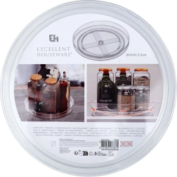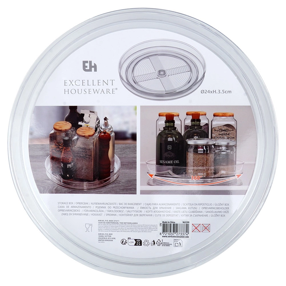 Praktiškas sukamasis organizatorius, kurio skersmuo 24 cm, o aukštis 3,5 cm, padės palaikyti tvarką virtuvėje, vonioje ir sandėliuke. Dėl pagrindo su 360° sukimu viską turėsite po ranka akimirksniu. Skaidri konstrukcija leidžia lengvai matyti laikomus daiktus, taupo vietą šaldytuve, spintelėse ir lentynose bei lengvai valomas paprastu nušluostymu.