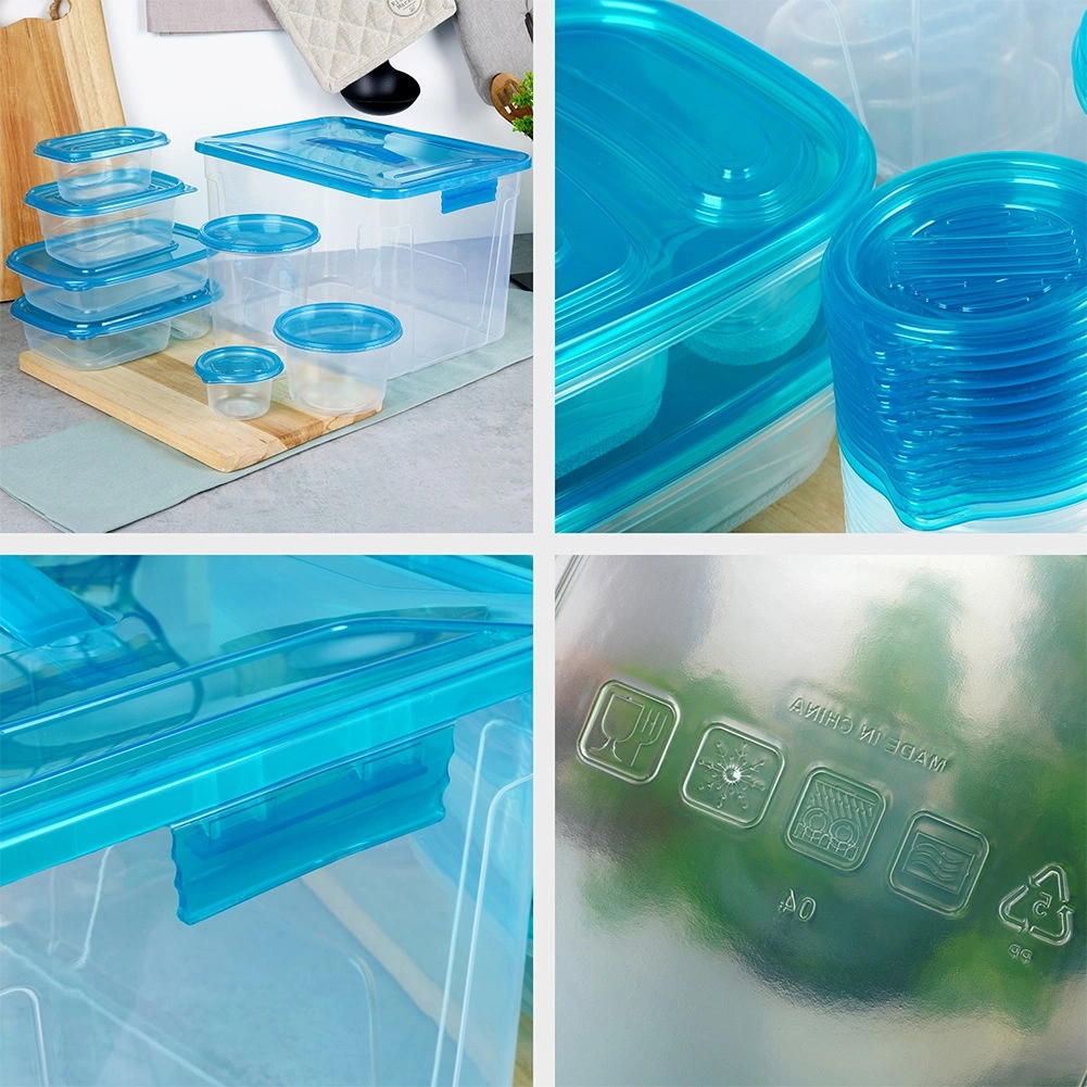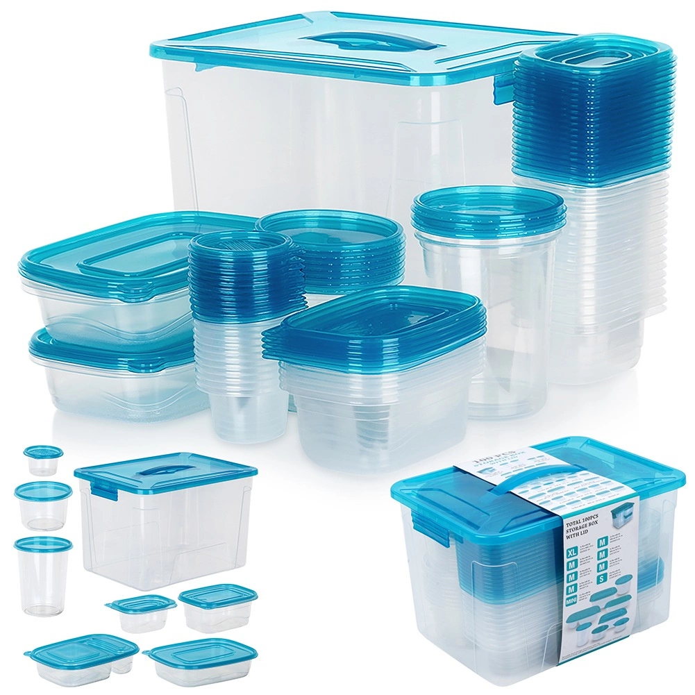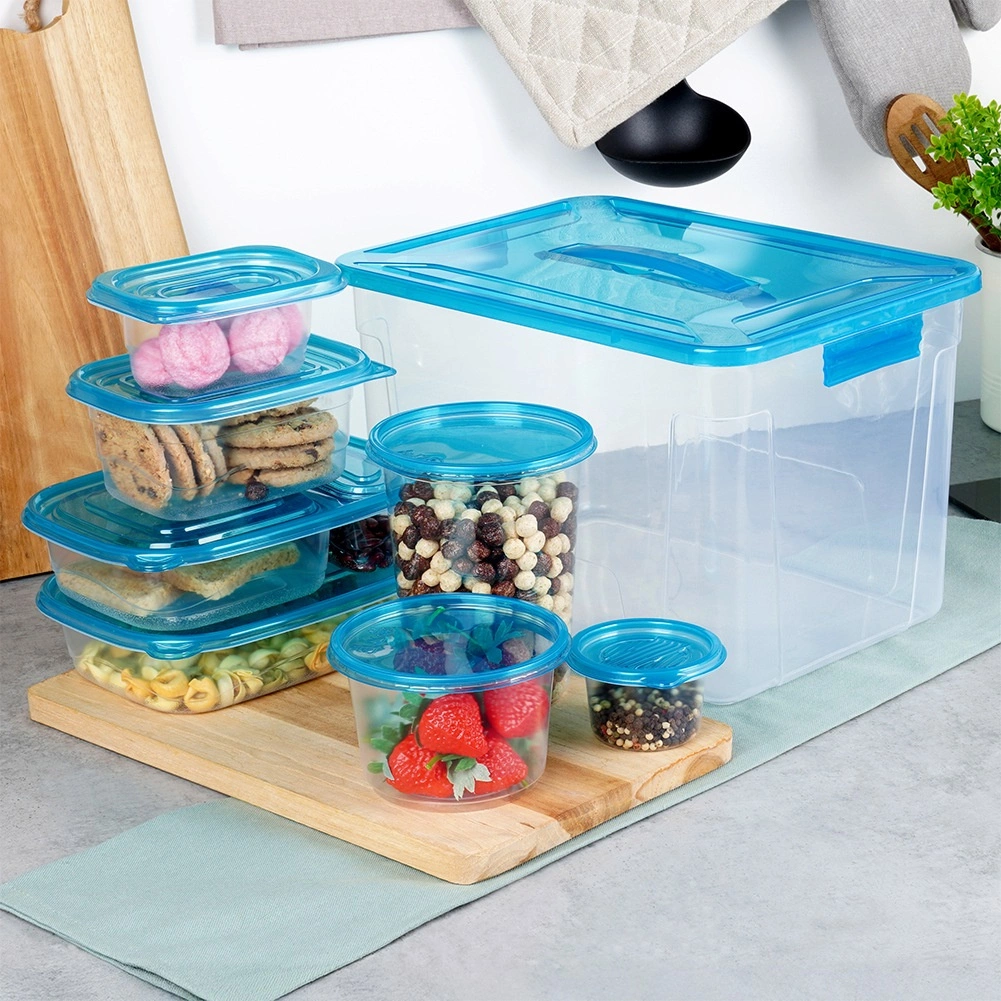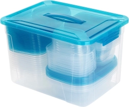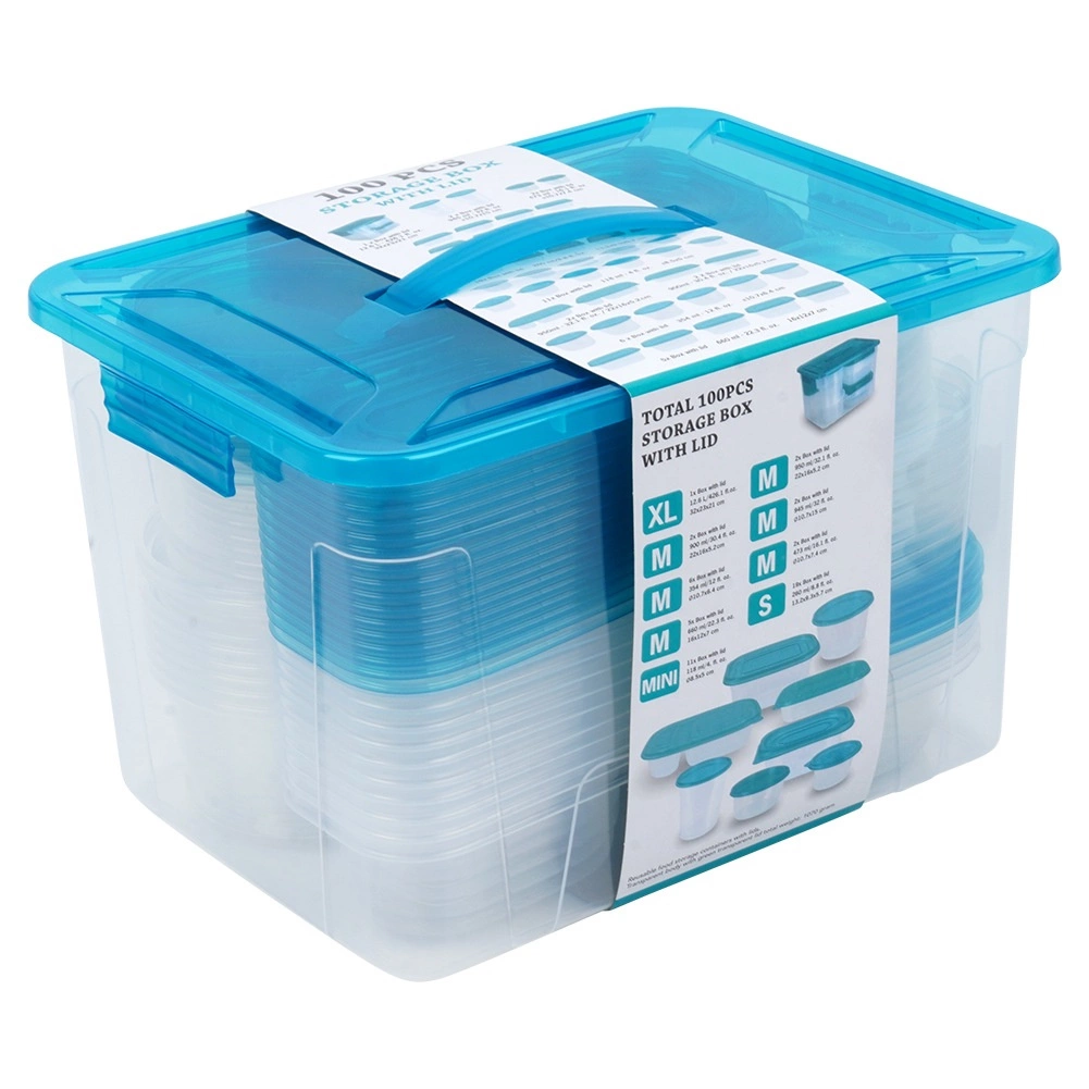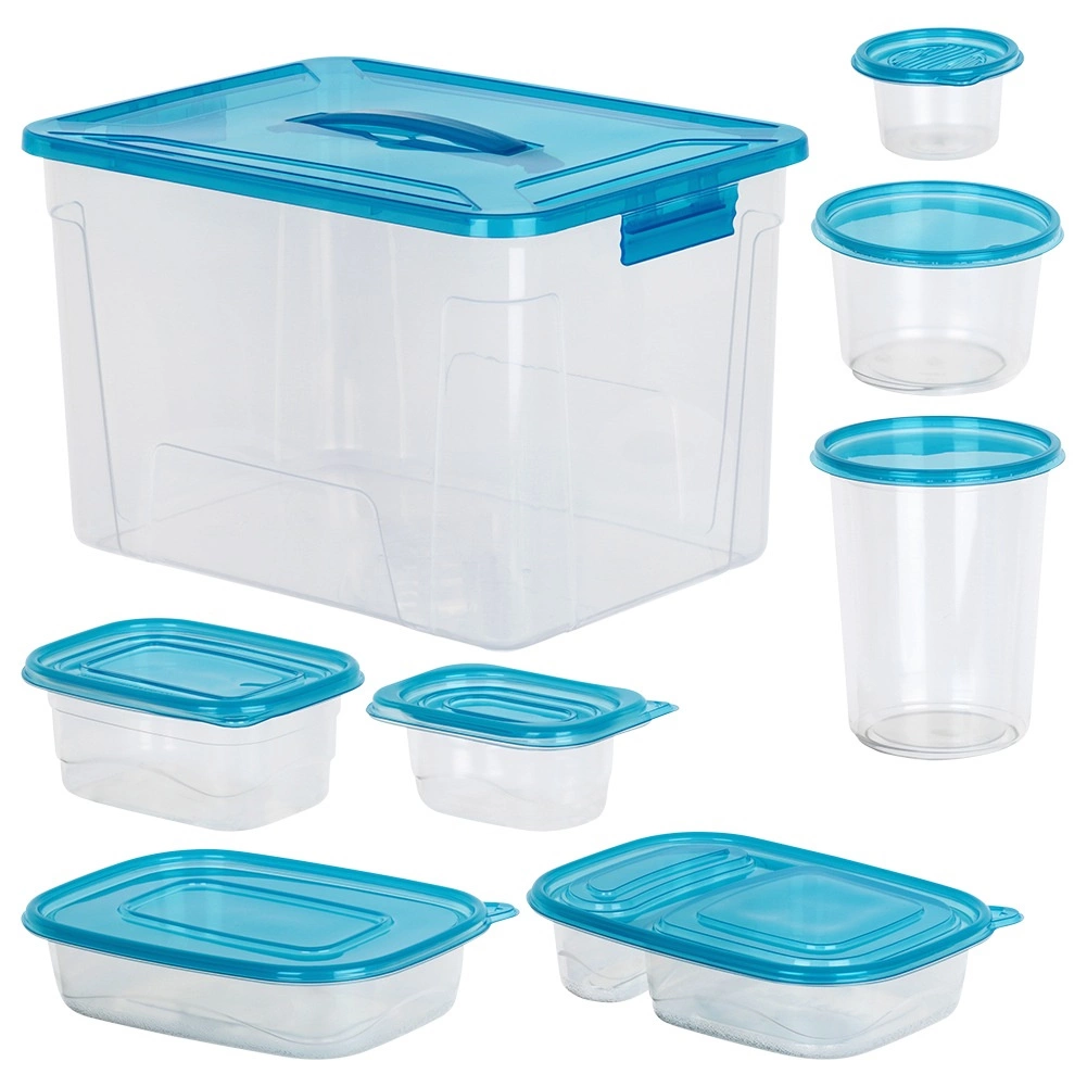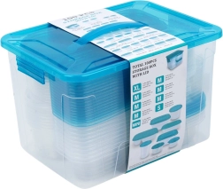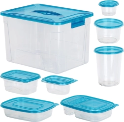 Praktiškas skaidrių maisto dėžučių su mėlynais dangteliais rinkinys devynių dydžių kasdieniam naudojimui. Hermetiškas uždarymas ilgiau išlaiko maistą šviežią, komplektuojamas ir sudedamas dizainas taupo vietą, o didelė dėžė su rankena leidžia patogiai laikyti visą rinkinį. Dėžutės yra saugios sąlyčiui su maistu, tinkamos šaldytuvui, šaldikliui, indaplovei ir mikrobangų krosnelei (šildyti be dangtelio).
