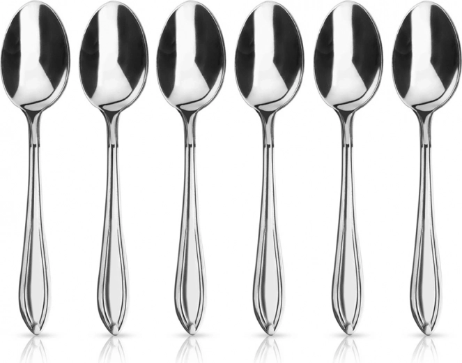 Praktiškas šešių šaukštelių rinkinys, papildysiantis bet kurį stalo komplektą ir suteiksiantis stalui iškilmingumo. Blizgi apdaila atrodo elegantiškai, o universalus dizainas tinka tiek klasikinėms, tiek modernioms servizų linijoms. Idealu patiekti kavai, arbatai ir desertams.